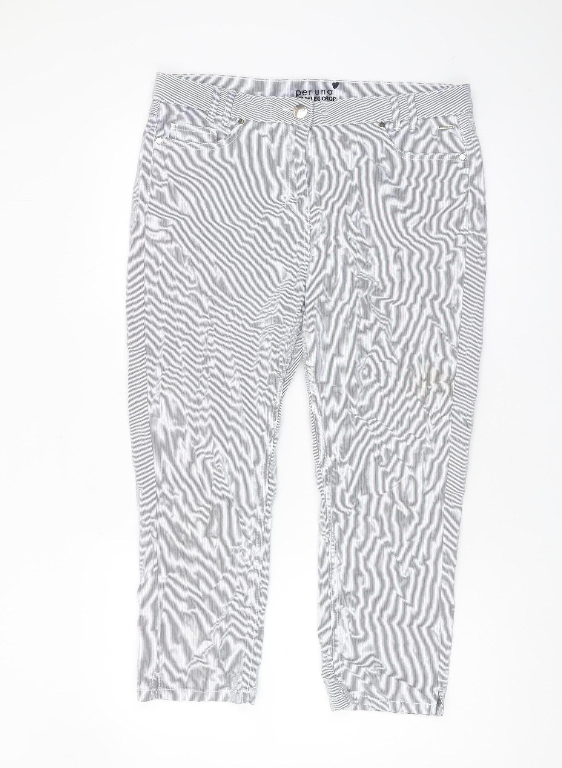 Step into style and comfort with these elegant cropped trousers from Marks and Spencer, perfectly tailored for the modern woman. In a fresh white hue complemented by a subtle striped pattern, these trousers are an ideal choice for spring and summer occasions. Crafted from a high-quality blend of 98% cotton and 2% elastane, they offer a soft touch and flexible wear, ensuring you stay comfortable all day long. Featuring a regular fit, these trousers provide the perfect balance of comfort and style. An elastic waist and button closure add to their practicality, while the mid-rise design offers a flattering silhouette. Ideal for casual outings, pair these trousers with your favourite top for a chic look. Their machine washable fabric type ensures easy maintenance, making them a convenient addition to your wardrobe. Whether you're enjoying a relaxed day out or an afternoon at the café, these trousers are your go-to choice for casual elegance. With slight markings and minor wear, they maintain a very good condition, offering you quality at an accessible price. Enhance your ensemble with these stylish Marks and Spencer cropped trousers and enjoy the timeless elegance they bring to your wardrobe.