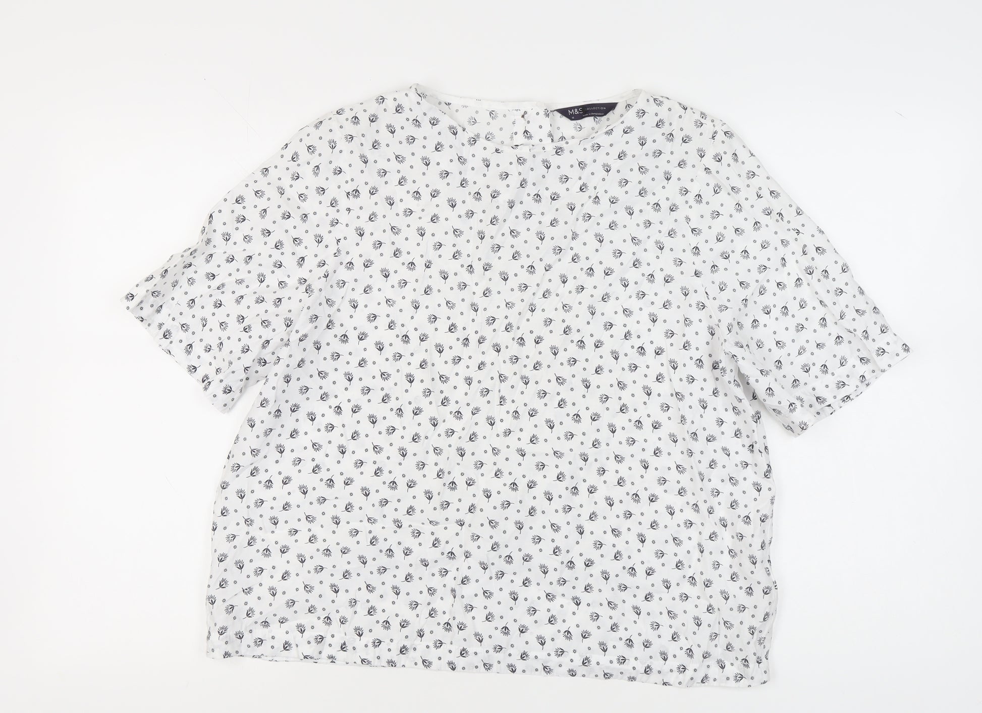 Elevate your wardrobe with this elegant Marks and Spencer women's blouse, perfect for adding a touch of sophistication to your everyday look. Crafted in a timeless white floral pattern, this blouse exudes grace and charm, making it an excellent choice for casual occasions or relaxed days out. The blouse is designed with a regular fit, ensuring comfort without compromising style. Its short sleeves and round neckline add a classic touch, while the lightweight cotton-polyester blend allows for all-day comfort, making it ideal for those warm sunny days. The material combination is both breathable and easy to care for, ensuring the blouse stays fresh and vibrant with minimal effort. Simply machine wash and wear, perfect for the modern, busy lifestyle. Whether paired with jeans for a casual brunch or dressed up with a skirt for an afternoon tea, this blouse offers versatility and ease. Its casual sleeve style makes it a go-to top for any laid-back event. This blouse is in excellent condition, free from any visible signs of wear, ensuring you look your best whenever you step out. Don't miss the chance to add this beautiful piece to your collection. With its unique design and high-quality fabric, it’s sure to become your favourite piece for any casual outing.
