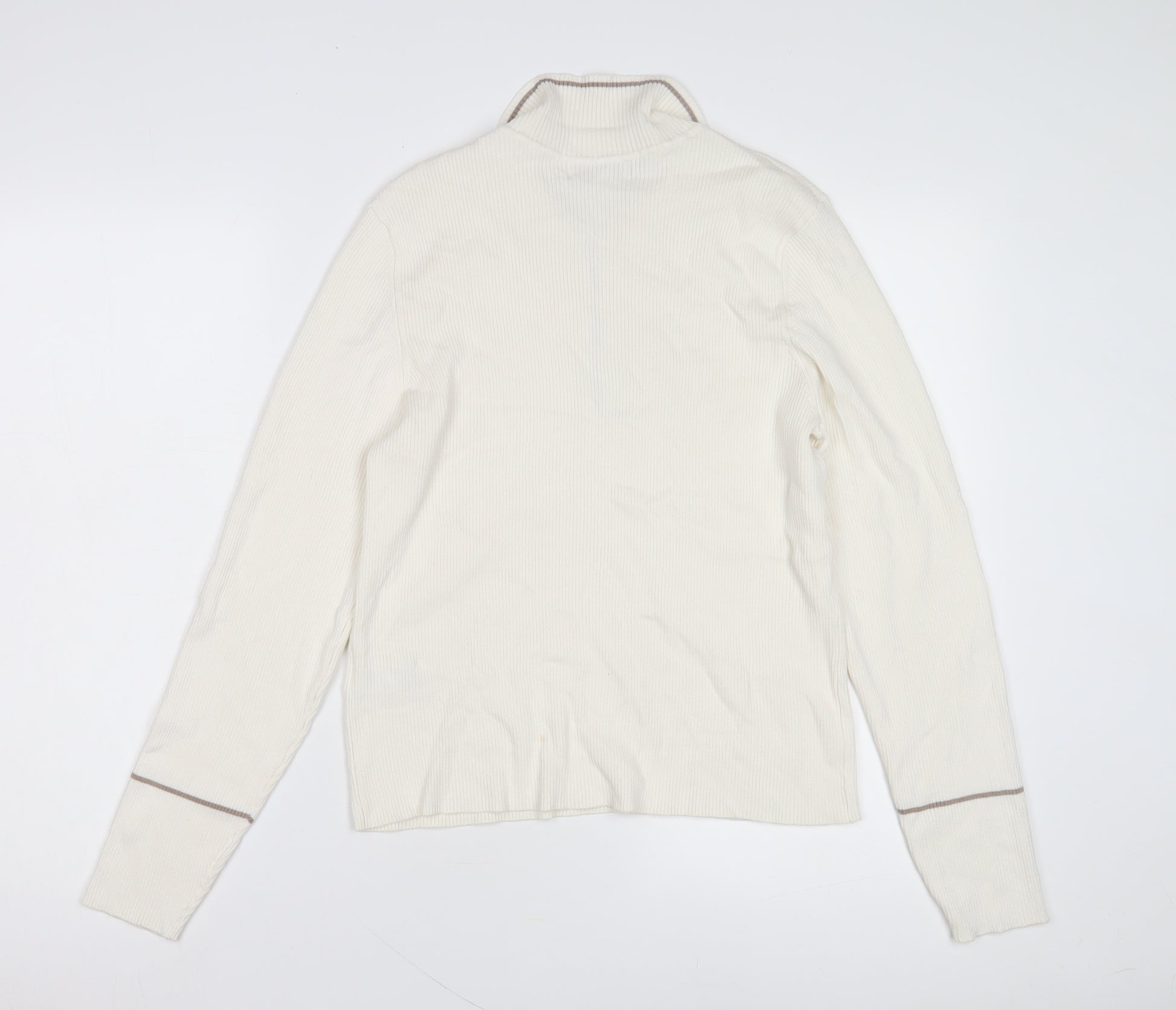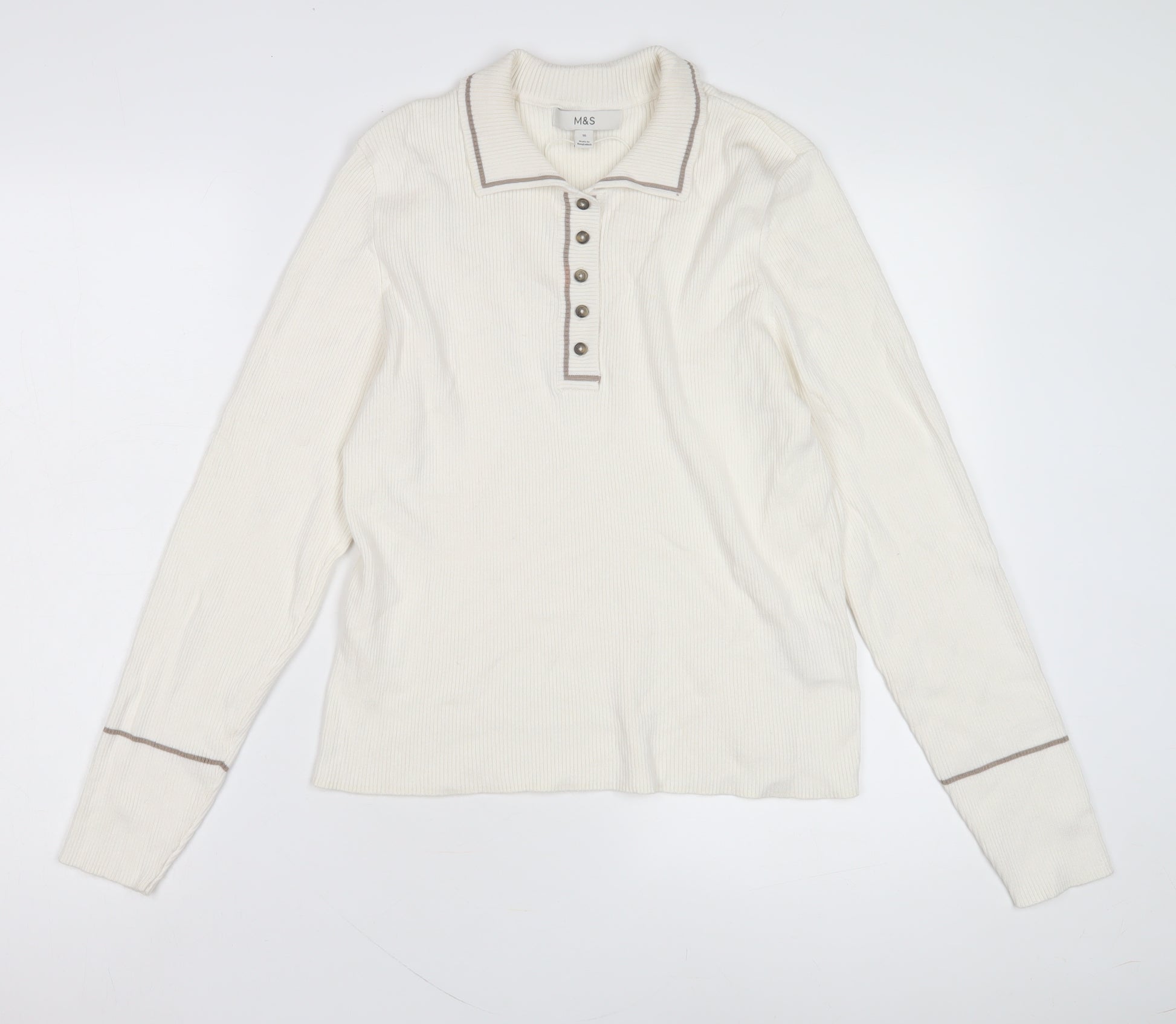 Elevate your wardrobe with this chic Marks and Spencer Women's Henley Jumper in a classic white shade. Crafted from 100% cotton, this tight-knit jumper offers both comfort and style, making it an ideal choice for casual wear. The collared neckline adds a touch of elegance, while the long sleeves ensure a warm yet breathable fit perfect for both spring and autumn seasons. Designed for the modern woman, this regular-sized jumper provides a relaxed fit that gracefully accentuates your silhouette. The machine washable fabric ensures easy garment care, making this piece as practical as it is stylish. Embrace versatility and simplicity with this No Pattern jumper, easily paired with your favourite jeans or skirts for a fresh, understated look. Perfect for any casual occasion, this jumper provides the perfect blend of comfort and fashion-forward design.