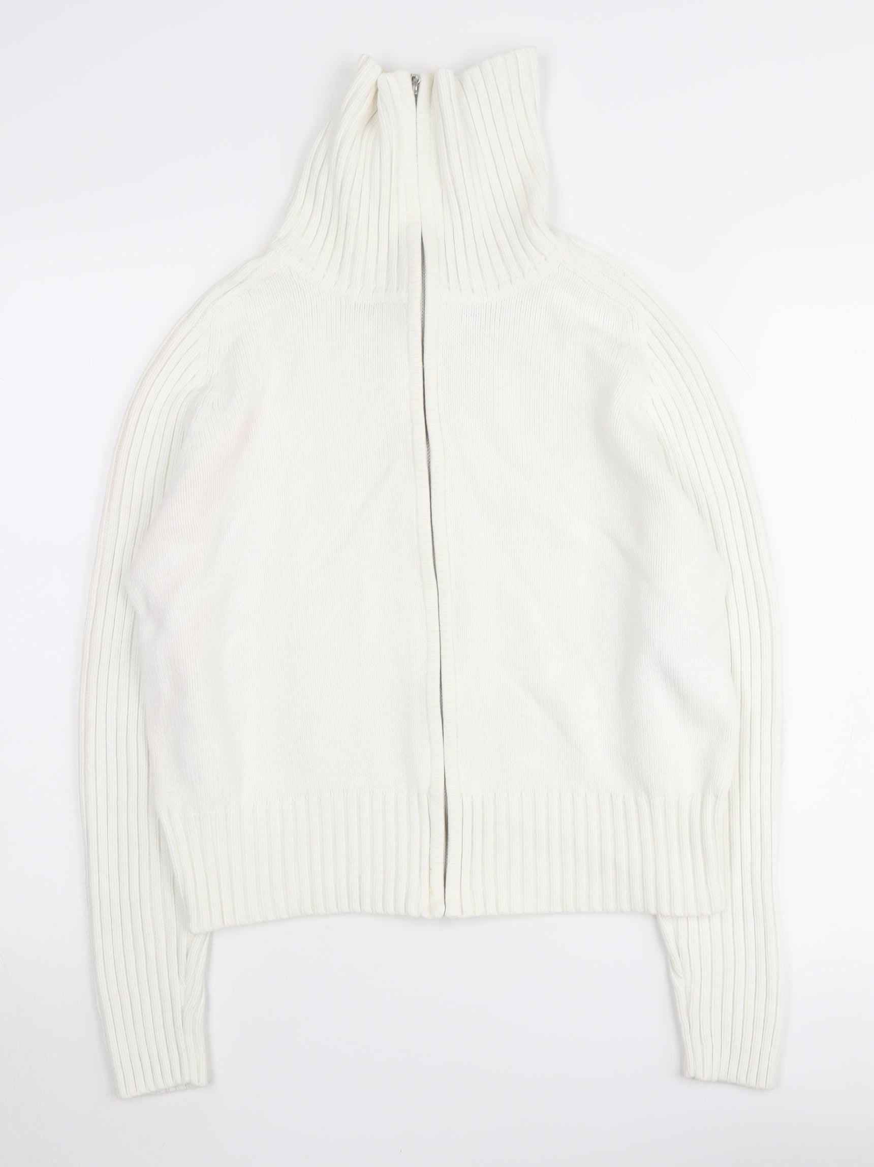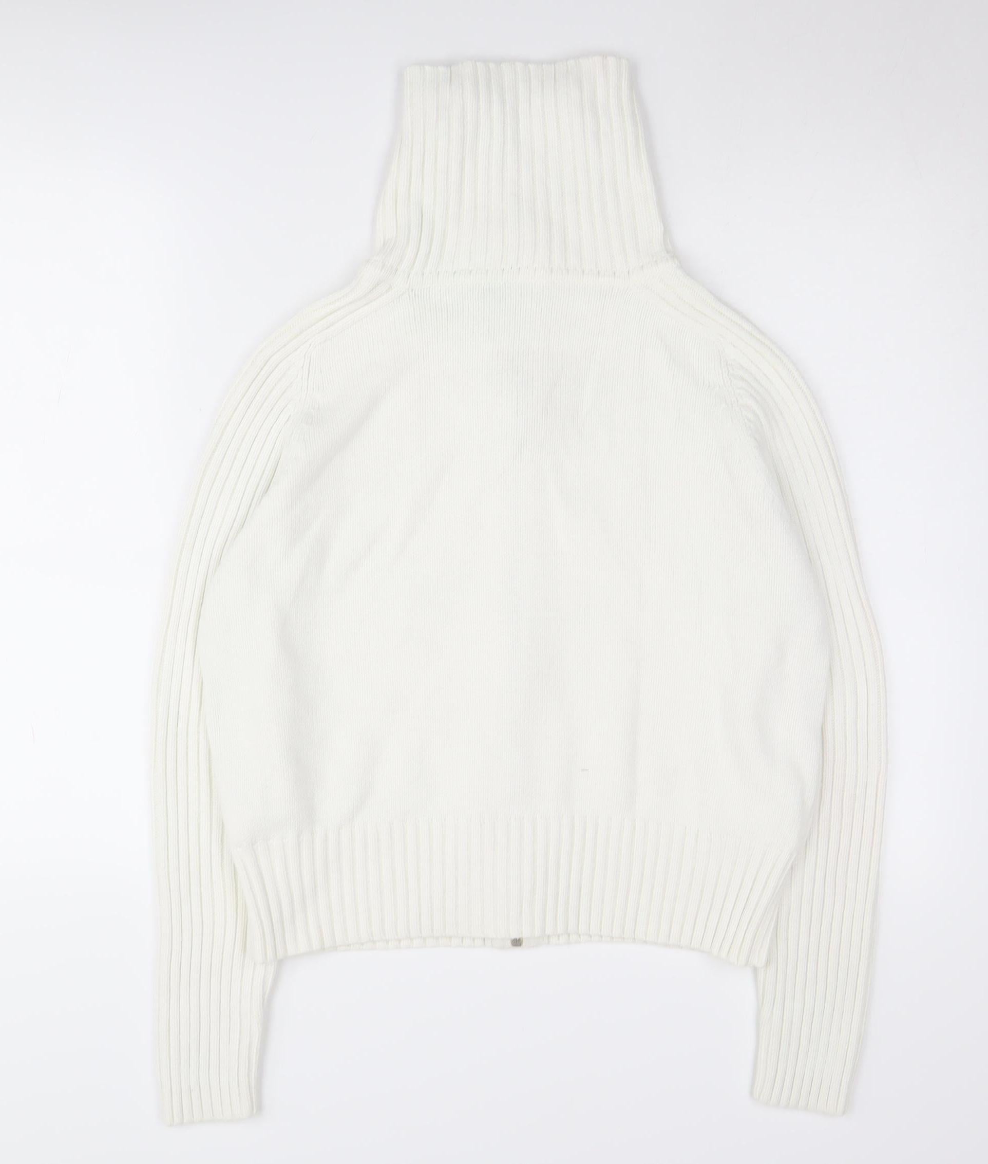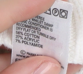 Elevate your seasonal wardrobe with this elegant white full-zip jumper from Marks and Spencer. Designed exclusively for women, this jumper boasts a sophisticated high neck that seamlessly blends style with comfort. Made from a premium blend of materials, including 56% cotton, 37% acrylic, and 7% polyamide, this piece offers a chunky-knit texture that is perfect for keeping warm during autumn and winter. The regular fit and long sleeves provide a classic silhouette that complements any casual occasion.Easy to care for, this jumper is machine washable, ensuring it remains a staple in your wardrobe season after season. The absence of pattern and the sleek white hue make it a versatile piece that pairs effortlessly with a variety of outfits. The full zip feature adds a modern touch, making this jumper not only practical but stylish.Whether you're dressing up for a casual day out or looking to add an extra layer of warmth, this jumper fits the bill. Its excellent condition, with slight wear and no visible tags, ensures it’s ready for many more days of cozy elegance. At an affordable price of £15.25, this jumper offers unmatched value, making it a must-have addition to your collection. Don't miss out on the opportunity to own this versatile, chic piece from Marks and Spencer.