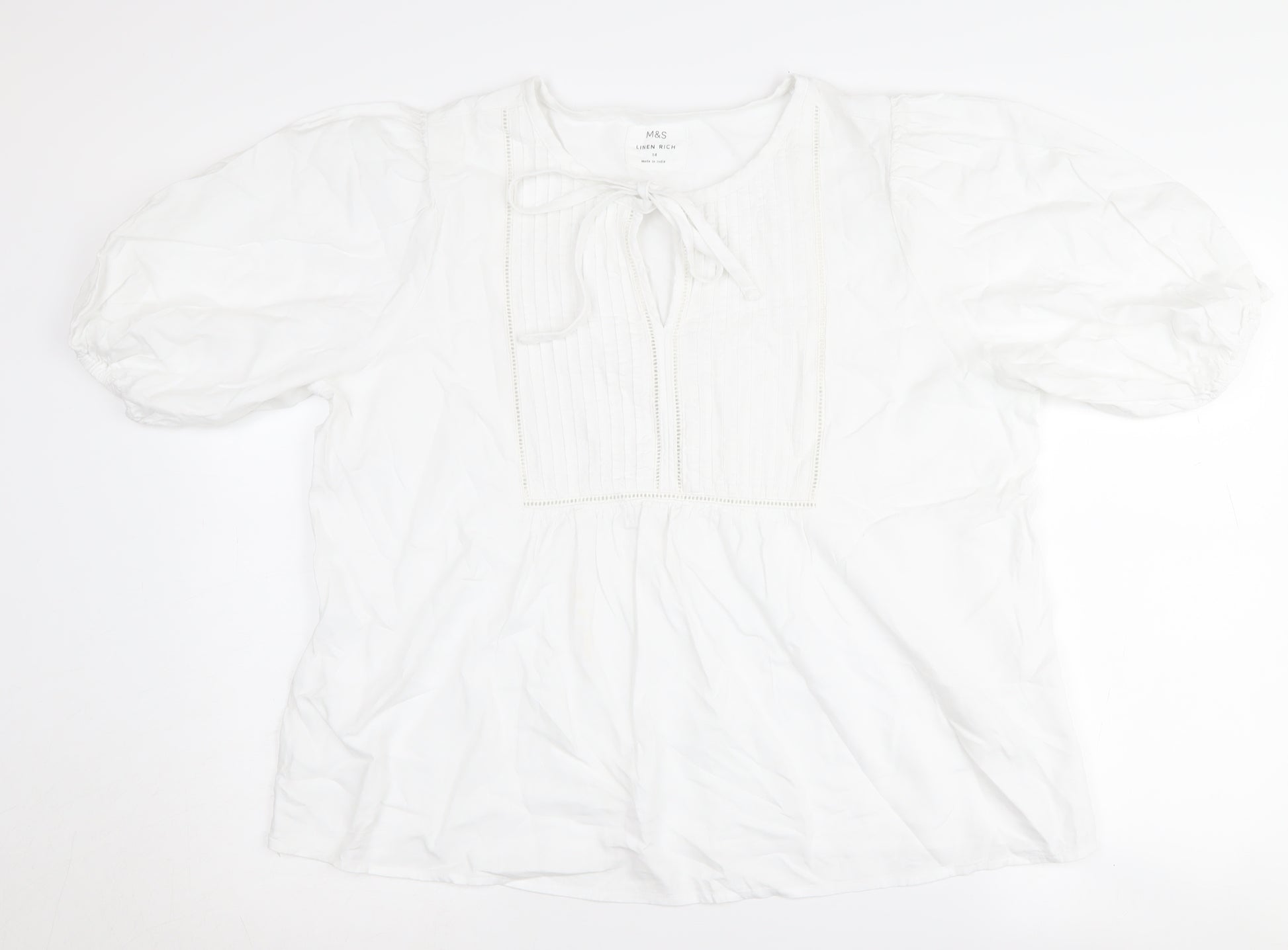Discover effortless elegance with this Marks and Spencer white linen top, ideal for women looking to add a touch of sophistication to their wardrobe. Crafted from a rich blend of 55% flax and 45% viscose, this piece ensures a comfortable fit with its breathable fabric, perfect for all-day wear. The solid white colour adds a timeless appeal, making it versatile enough for both casual outings and more formal occasions. The puff sleeves add a hint of drama and fashion-forward style to this classic piece. Designed in a regular size 14, this top is machine washable, ensuring easy maintenance and longevity. Whether you pair it with your favourite jeans for a laid-back look or dress it up with a tailored skirt for a more polished ensemble, this top is bound to become a staple in your clothing collection. Ideal for spring and summer, the lightweight material will keep you cool and chic no matter the occasion. With no visible sales tags, the top is in good condition with the only noticeable signs being slight creases that do not detract from its overall appeal. Elevate your style with this elegant top that seamlessly blends comfort and fashion, perfect for the modern woman on the go.