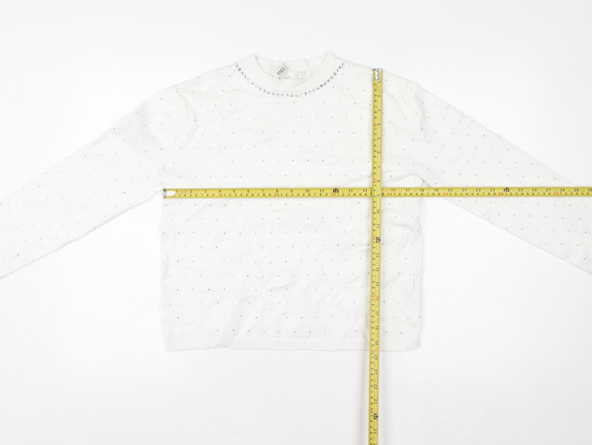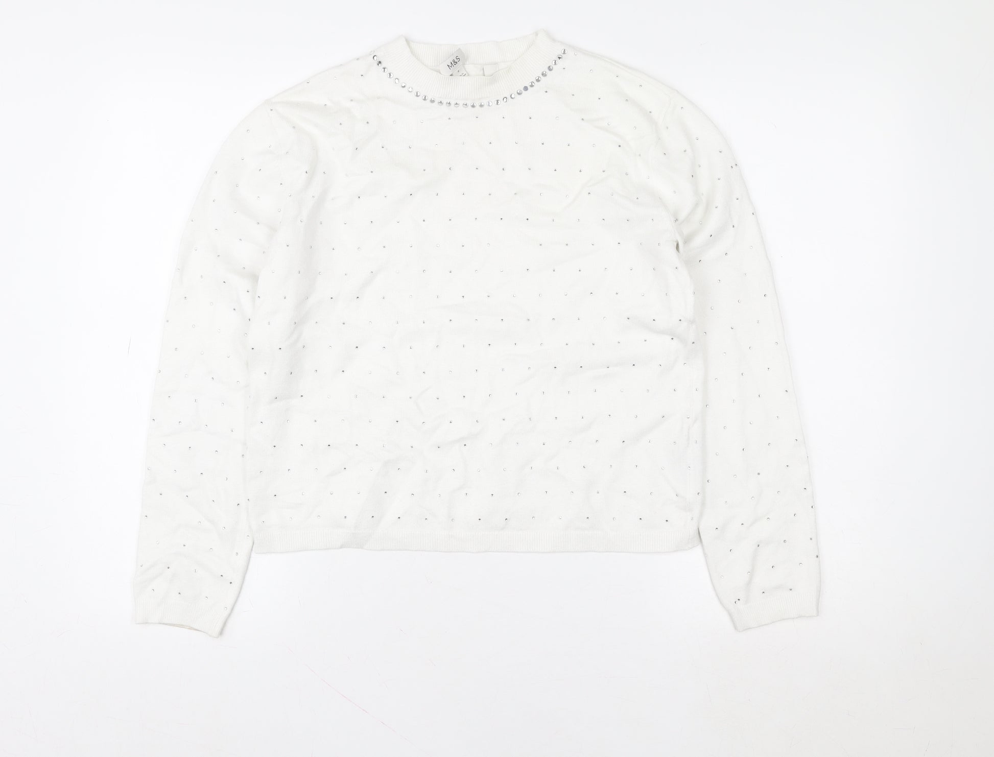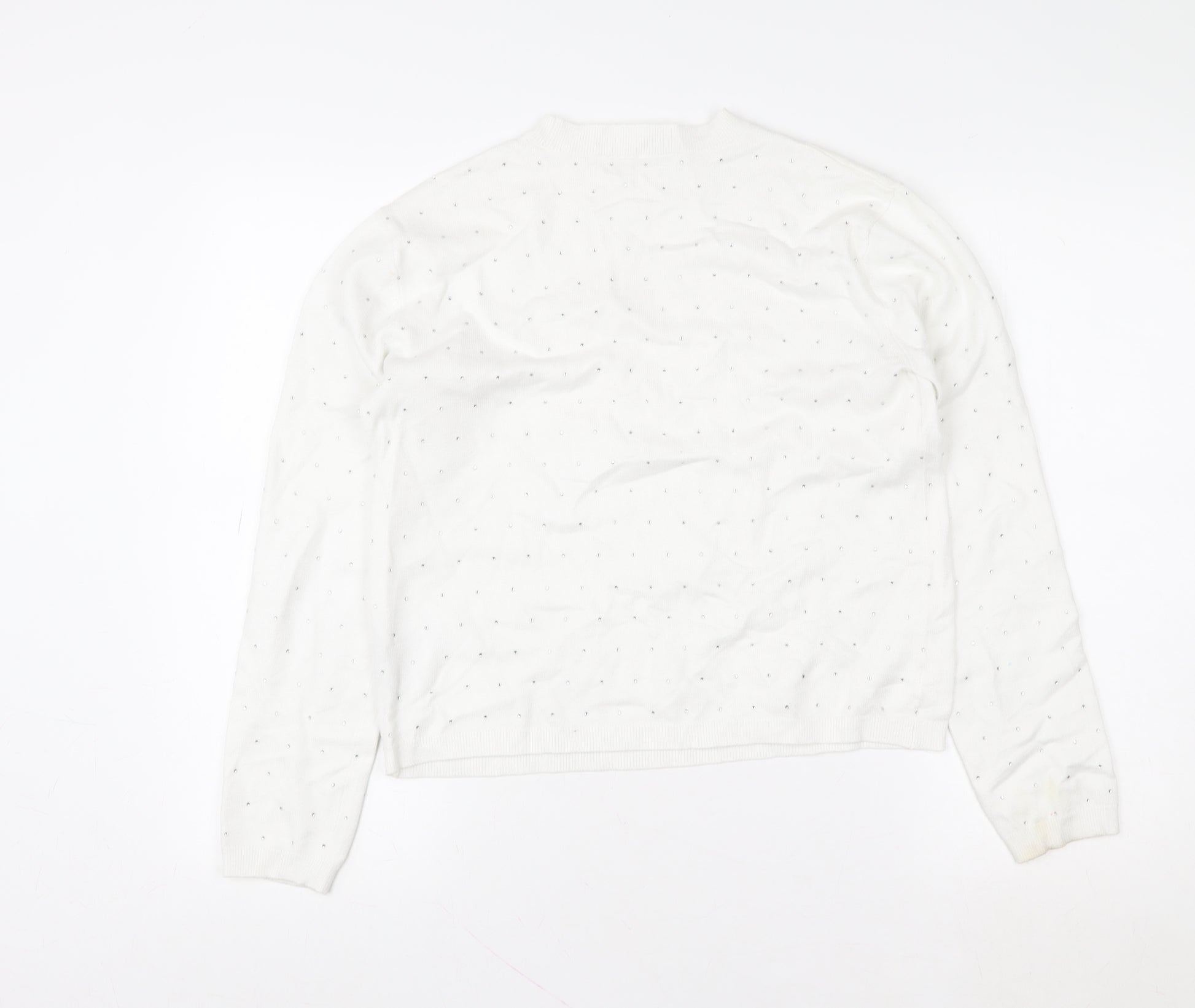 This elegant Marks and Spencer women's white pullover sweatshirt offers a refined casual look with a touch of sparkle. Designed in a soft knit fabric, it features delicate crystal-style embellishments across the front and neckline, elevating a classic silhouette into something truly eye-catching. The crew neckline and ribbed trims ensure comfort and shape retention, making this jumper ideal for everyday wear or smart-casual occasions. Crafted with long sleeves, the lightweight knit provides warmth without bulk, perfect for layering from autumn through spring. The versatile white finish complements a wide range of wardrobe styles, pairing beautifully with jeans, skirts, or tailored trousers. The flattering fit is relaxed yet feminine, designed for easy wear and timeless appeal. This Marks and Spencer sweatshirt is ideal for those who love understated sophistication with subtle sparkle. Whether worn at the office, for lunch dates, or cosy evenings, its classic shape and neutral tone make it a reliable go-to for many outfits. The embellishments ensure it stands out while remaining elegant and practical. This garment is in excellent pre-owned condition with minor discolouration on the cuff, consistent with light wear. A premium choice for those seeking quality and comfort from a trusted British brand.