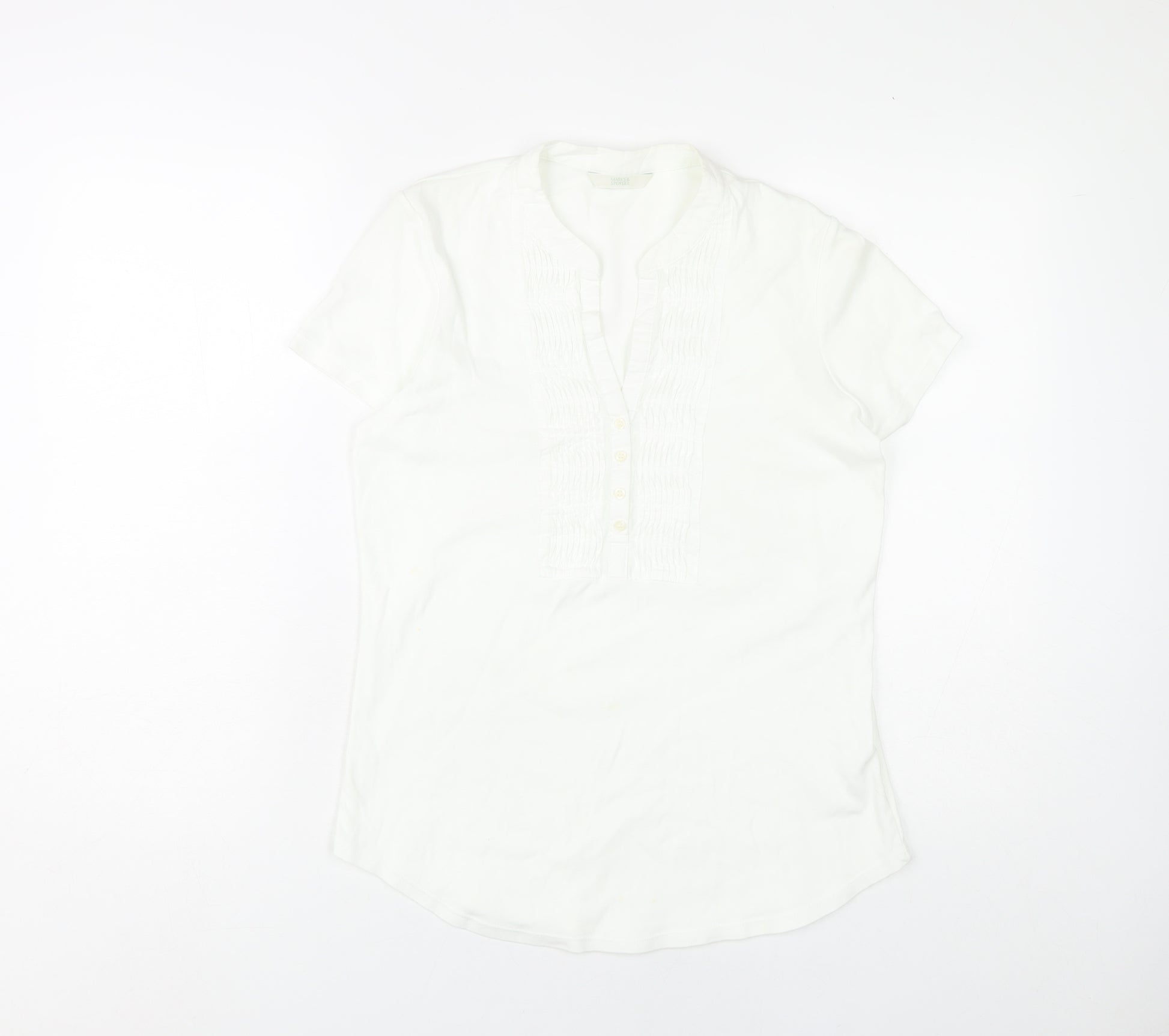 Elevate your casual wardrobe with this charming Marks and Spencer Women's White Short Sleeve Top. Crafted from 100% cotton, this top offers unparalleled comfort and breathability for all-day wear. The solid white hue and classic round neck design make it a versatile piece that can be paired with a variety of outfits, whether you're heading to a casual brunch or a relaxed afternoon out. The button closure accent adds a touch of simplicity and elegance, allowing for easy wear and removal. Its regular fit and classic fitted sleeves ensure that this top drapes beautifully over the body, providing a flattering silhouette for any body type. Perfect for all seasons, this top is an essential addition to any wardrobe, offering style without compromising on comfort. Pair it with jeans or a skirt to create a look that is effortlessly chic. This piece is machine washable, making it both practical and stylish. Don’t miss the opportunity to add this versatile piece to your collection – it’s bound to become a favourite staple.