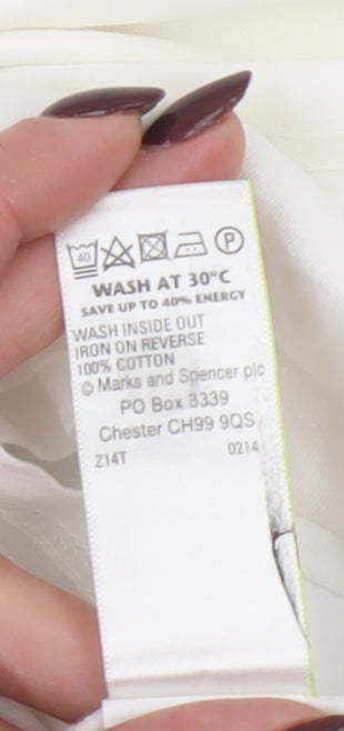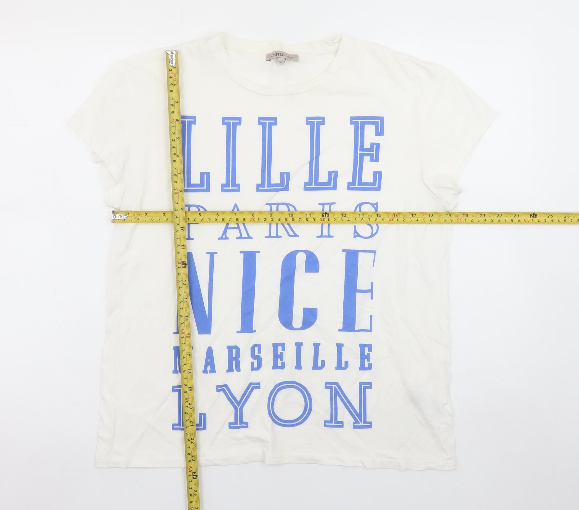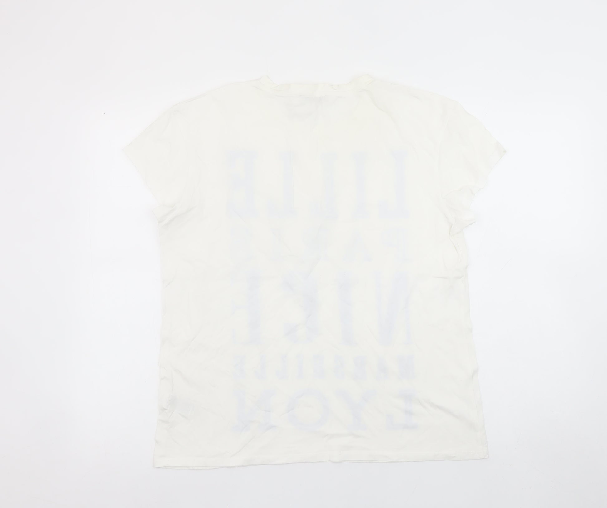 This stylish Marks and Spencer Women's T-Shirt in size 12 offers a laid-back yet fashionable touch for everyday wear. Crafted entirely from 100% cotton, it provides the comfortable softness and breathability you expect from a jersey-knit fabric, making it an easy choice for warmer seasons. The fresh white colour, coupled with bold blue printed lettering of famous French cities including Lille, Paris, Nice, Marseille, and Lyon, gives this piece a fun and modern travel-inspired vibe. The crew neckline and classic short sleeves contribute to a timeless silhouette that complements a wide range of styles. Suitable for casual daytime outfits and effortless weekend dressing, this T-shirt pairs perfectly with jeans, shorts, or skirts for an easygoing look. The lightweight cotton construction ensures all-day comfort, while the pullover fit adds convenient wearability. Though pre-loved, this top remains in excellent condition with no visible flaws or marks. Marks and Spencer’s reputation for high-quality wardrobe essentials is evident in its fine finish and reliable comfort. Ideal for spring and summer, it is versatile enough for travel, holidays, or casual outings. Whether you're exploring the city or relaxing at home, this cotton tee adds a touch of continental charm to your everyday wardrobe. Enjoy the breathable feel and easy-care machine-washable fabric that maintains its shape and appearance after wear. Enhance your style with this crisp and contemporary T-shirt that embodies effortless fashion and practical appeal — a perfect addition to any woman's casualwear collection.
