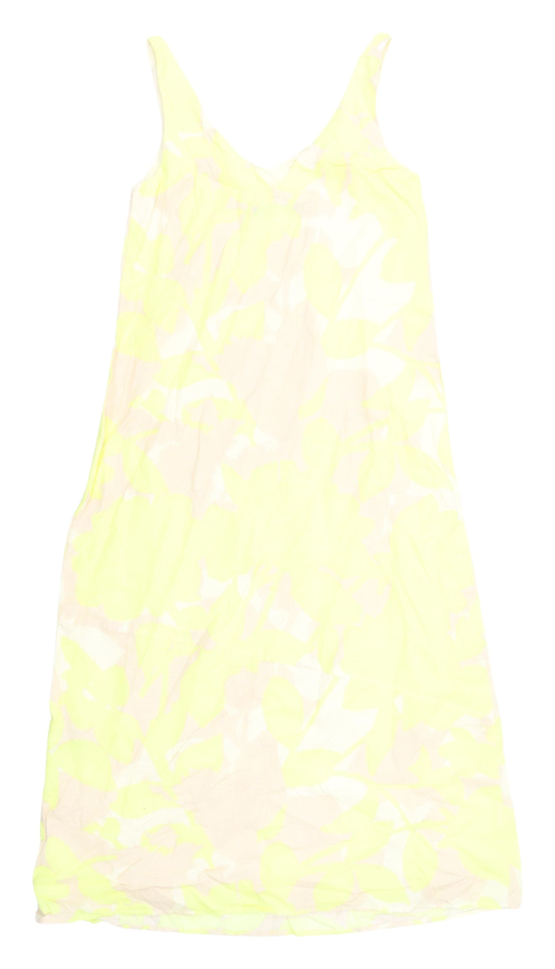This exquisite Marks and Spencer slip dress in a serene yellow floral pattern is the perfect addition to your summer wardrobe. Designed for women, this piece features a fresh and breezy aesthetic ideal for casual outings or travel adventures. The dress is made from a blend of 55% linen and 45% cotton, ensuring comfort and breathability in warmer weather. With its sleeveless design and strappy style, it accentuates a relaxed yet stylish look. The V-neck neckline adds a touch of elegance, making it a versatile option whether you're headed to the beach or a picnic in the park. Its regular size 6 fit caters to a tailored silhouette, and the pullover closure offers easy wearability. Certified as machine washable, maintenance is hassle-free, keeping you ready for spontaneous summer adventures. This non-vintage dress embraces a classic charm with its simple yet effective design, making it a timeless piece that you'll reach for year after year. Experience the luxury and comfort of natural fabrics with this standout Marks and Spencer creation.