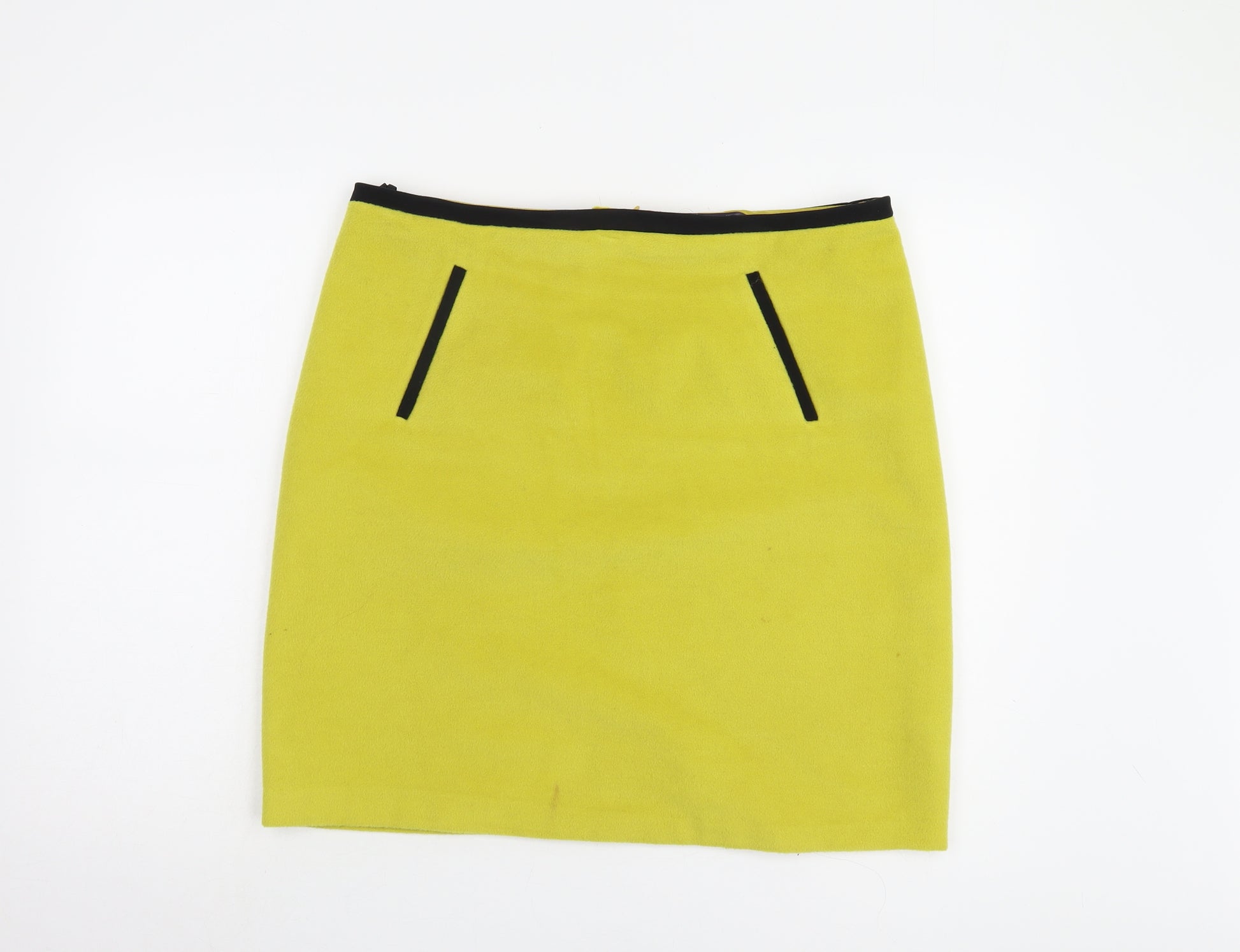 Elevate your wardrobe with this chic Marks and Spencer pencil skirt, perfect for any occasion. Crafted in a vibrant yellow hue, this knee-length skirt is tailored to enhance your silhouette with its straight and pencil style. Designed for women who appreciate elegance and functionality, it features handy pockets and a convenient zip closure, making it a practical choice for workwear or formal events. Made from a quality blend of 85% polyester and 15% wool, the skirt ensures comfort and durability while remaining easy to care for with a machine washable finish. Ideal for any season, its simple yet sophisticated design boasts a high-rise fit that flatters your waistline. Though in excellent pre-owned condition, the skirt does have a slight mark, but this minor imperfection doesn’t detract from its overall appeal. Add a pop of colour and timeless style to your outfit with this essential piece, perfect for work or a night out. Don't miss out on adding this to your collection!