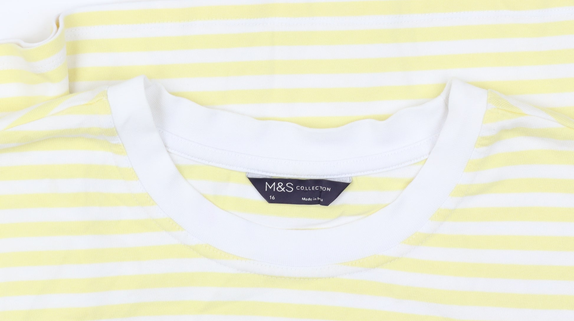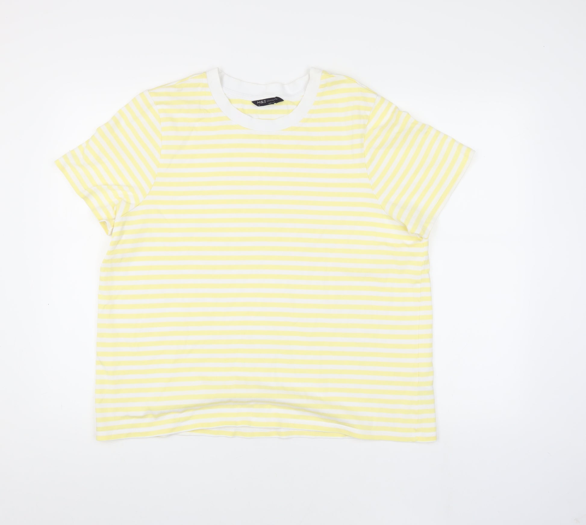 Add a splash of sunshine to your wardrobe with this vibrant Marks and Spencer women's T-shirt, perfect for casual outings in the warmer months. Crafted from 100% cotton, this breathable and lightweight tee offers maximum comfort. Its cheerful yellow striped pattern and classic crew neck design make it both stylish and versatile, ready to pair with any casual jeans or shorts. Designed with short sleeves and a regular fit, it allows for easy movement while maintaining a flattering silhouette. An easy-care garment, this T-shirt is machine washable, making it a durable choice for everyday wear. Ideal for spring and summer occasions, whether you're heading to the park, meeting up with friends, or simply relaxing at home. Embrace casual elegance with this charming, easy-to-wear top.