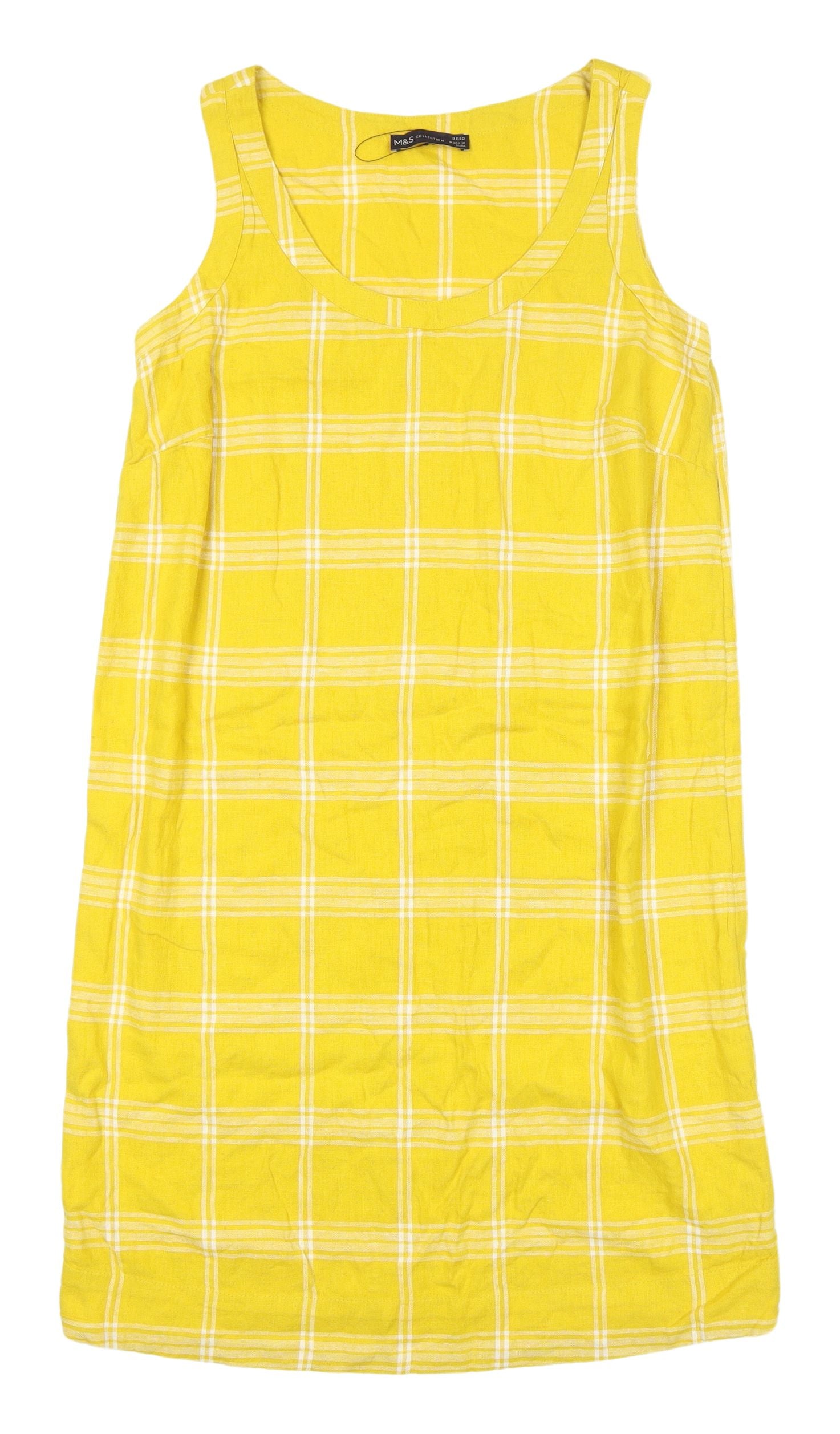 Add a splash of colour to your wardrobe with this charming Marks and Spencer yellow check dress. Ideal for casual outings, this dress combines a timeless check pattern with a breezy summer design. Fashioned in a relaxed fit, this shift dress guarantees comfort without compromising on style. Made with a durable blend of 55% linen and 45% viscose, it embodies quality and effortless chic. Perfect for warm weather, its sleeveless cut allows for easy layering or standalone wear. The scoop neckline adds a subtle touch of elegance, making it versatile enough for various events. Whether you're heading for a picnic or catching up with friends, this yellow piece ensures you stand out. Despite slight wear on the fabric, this dress retains its excellent condition, promising to be a staple in your summer wardrobe. Machine washable for convenience, it's as easy to care for as it is to wear. Embrace relaxed style with this versatile Marks and Spencer number.