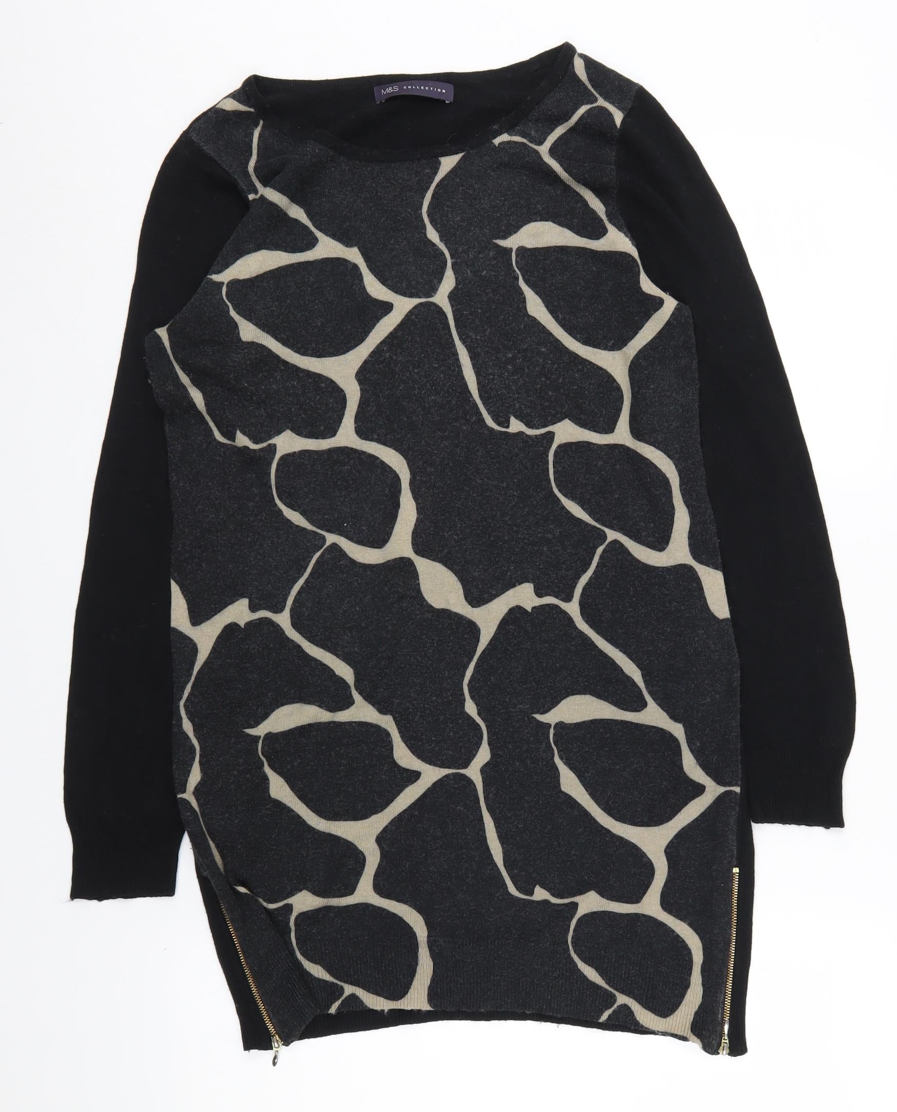 Elevate your wardrobe with this stylish Marks and Spencer women's tunic blouse, featuring a unique animal print pattern in classic black. Perfect for casual outings, this long-sleeve knit top is designed for comfort and fashion. The boat neckline adds a touch of elegance, while the fitted sleeves and zip accents enhance its contemporary appeal. Crafted from a high-quality blend of polyamide, viscose, cotton, and angora, this blouse is both cozy and breathable, making it ideal for autumn and winter wear. Its regular fit and tunic style provide a flattering silhouette for any body type. Whether you're heading to a relaxed brunch or a day at the park, this versatile piece will keep you looking chic and effortlessly stylish.