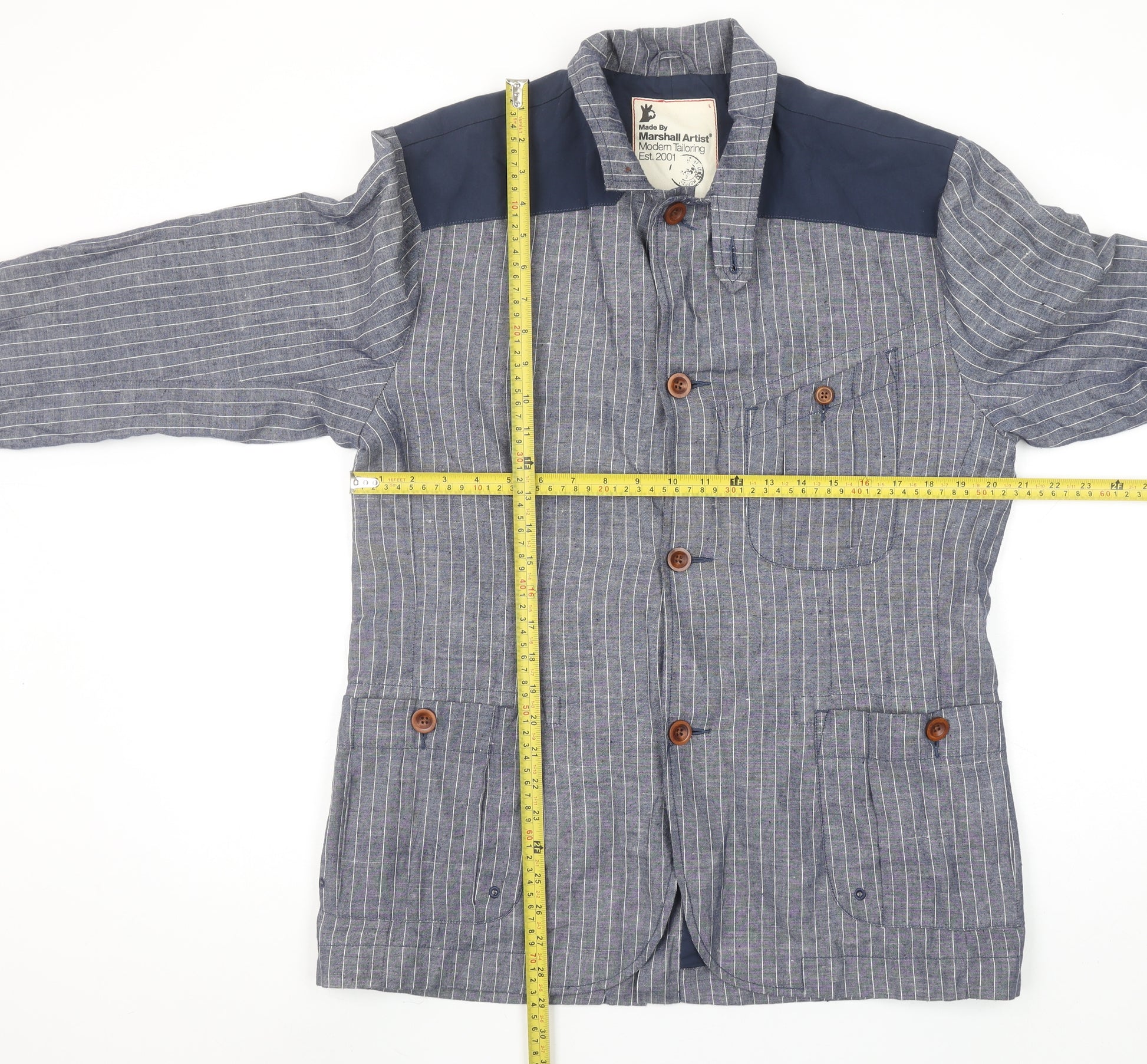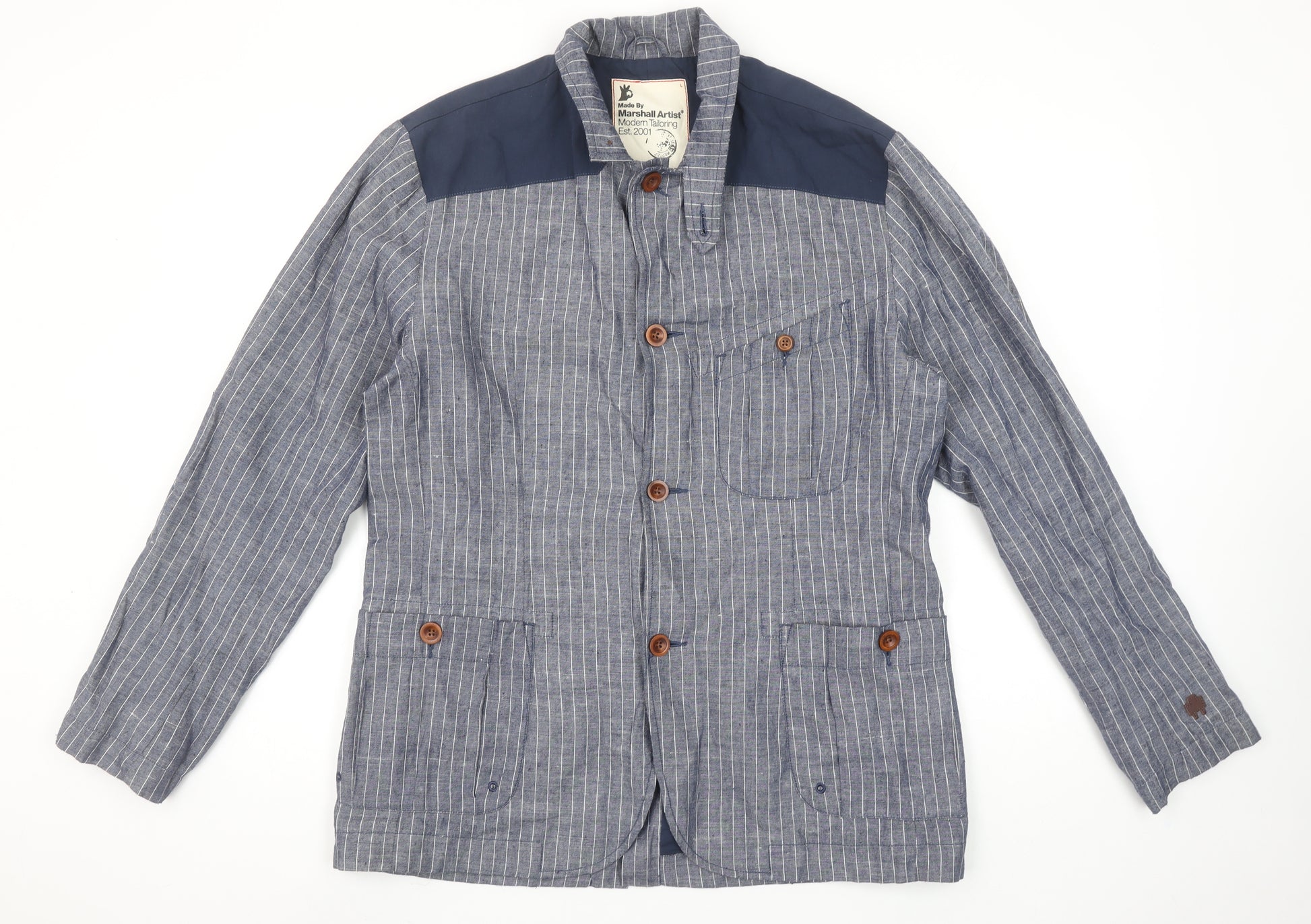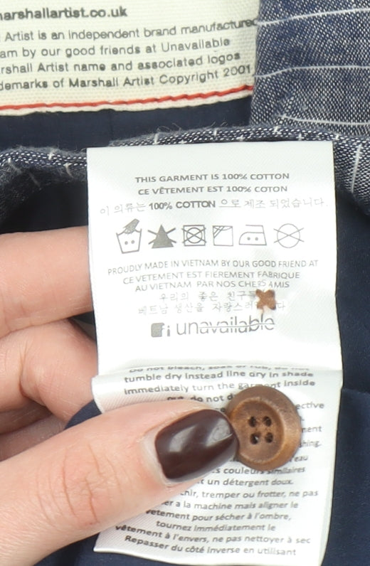 Give your casual wardrobe a refined update with this Marshall Artist men’s blue striped blazer in size L. Expertly crafted from 100% cotton, this lightweight jacket embodies modern tailoring with a relaxed, contemporary edge. The smart striped pattern in a classic blue hue is complemented by darker shoulder panels and elbow patches, blending workwear appeal with sophisticated detail. The piece features a single-breasted four-button front, three-button cuffs, and a double-vented back for unrestricted movement. Practicality comes from multiple front pockets, including two lower flap pockets and a chest pocket — perfect for everyday carry. The blazer’s regular fit ensures lasting comfort, while the pure cotton fabric makes it breathable and suitable for spring and summer wear. Ideal for smart-casual or leisure occasions, this jacket pairs effortlessly with chinos, denim, or tailored trousers for a clean, confident look. Finished with the brand’s signature detailing and precision-stitched design, this Marshall Artist blazer brings timeless British craftsmanship into everyday fashion. In excellent pre-owned condition with light wear only, it promises both durability and style, reflecting the understated quality associated with the brand’s modern tailoring heritage. A distinctive piece that works perfectly between formal and relaxed settings, embodying effortless sophistication for men who value versatile fashion.
