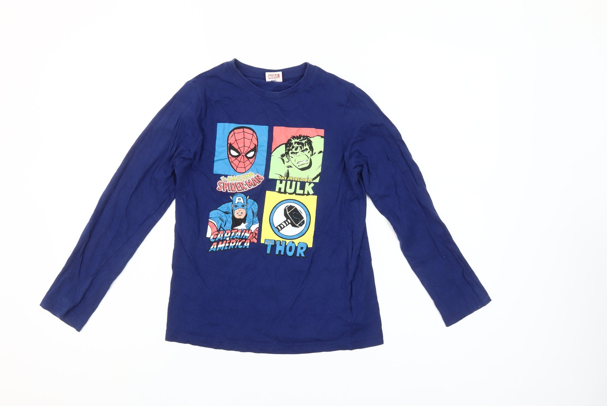 This Marvel Boys Long Sleeve Pyjama Top is the perfect nightwear choice for young superhero fans. Crafted from 100% cotton jersey, it offers a soft, breathable feel that keeps kids comfortable through the night or during relaxed lounge time. The bold blue fabric is brightened up by a vibrant graphic print of beloved Marvel superheroes—Spider-Man, Hulk, Captain America, and Thor—making it an exciting addition to any child’s sleepwear collection.Designed with a crew neckline and long sleeves, this pyjama top provides extra warmth, making it ideal for autumn and winter use. The pullover style ensures easy dressing, while the lightweight cotton fabric allows free movement and gentle comfort for bedtime or lounging. Its durable stitching and high-quality print showcase the signature Marvel Comics branding, ensuring it’s both fun and reliable.Although gently pre-loved, this piece is in very good condition with no visible stains or damage, only light creasing from storage. It has been well cared for and retains rich colour and shape. Sized for 9–10 years, the fit is true to size with ample stretch and comfort. The easy-care, machine washable cotton makes cleaning simple for busy families.Perfect for boys who adore superheroes, this pyjama top can pair effortlessly with matching pyjama bottoms or worn alone as a cosy lounge shirt. Whether dreaming of saving the day or relaxing after adventures, this Marvel pyjama top will become a bedtime favourite.A fantastic blend of comfort, colour, and iconic style, it’s a must-have for kids who love their bedtime to be full of hero energy. Priced at just £6.75, it delivers outstanding value for genuine Marvel quality and design.