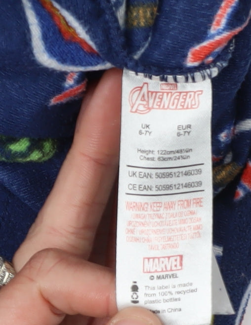 Introduce your little superhero to the Marvel universe with this delightful Avengers pyjama top. Designed for comfort and style, this blue, fleece pyjama top is perfect for boys aged 6-7 years. Featuring iconic Avengers graphics, it captures the imagination with its vibrant prints of beloved superheroes. Crafted from 100% polyester, this lightweight pullover provides cosy warmth and ease of movement, making it ideal for all seasons. Easy to care for, it's machine washable, allowing for quick and simple cleanup after a day's play. The long sleeves and crew neck design ensure a snug fit, providing both style and comfort for your child. Whether it's for bedtime adventures or lounging at home, this pyjama top is a fantastic choice for any young Marvel fan. Sold new with tags, it makes for an excellent gift or addition to any young superhero's wardrobe. Encourage dreams of saving the world with their favourite Avengers by investing in this remarkable piece today.