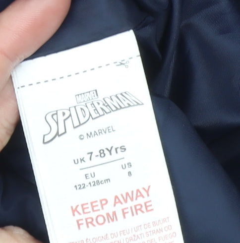 Keep your young superhero cosy and stylish with this Marvel Spider-Man hooded bodywarmer designed for boys aged 7-8 years. Crafted from durable 100% polyester, this mid-length sleeveless waistcoat offers both warmth and ease of movement, making it perfect for layering over jumpers or long sleeves during cooler autumn and winter days. The colour combination of navy blue and red, complemented by detailed Spider-Man embroidery and a web motif, gives this piece a bold and fun look that kids will love. Practical features include a full front zip with a Spider-Man-themed zipper pull, a soft padded design for extra comfort, and a cosy lined hood to help protect against chilly weather. The sturdy zip closure makes dressing simple, while the breathable fabric ensures all-day comfort whether worn for playtime, school, or weekend adventures. Designed for casual and activewear occasions, this versatile gilet can be styled easily with jeans, joggers, or track bottoms for everyday wear. Its careful construction and lightweight polyester insulation ensure durability while offering warmth without bulk. The eye-catching superhero graphics add a playful yet authentic Marvel finish. In excellent pre-loved condition, this boys’ gilet shows only minimal signs of previous use and maintains vibrant colours and shape. A must-have addition to any young Spider-Man fan’s wardrobe, this outerwear piece perfectly combines practicality, comfort, and superhero style for energetic kids ready for adventure.