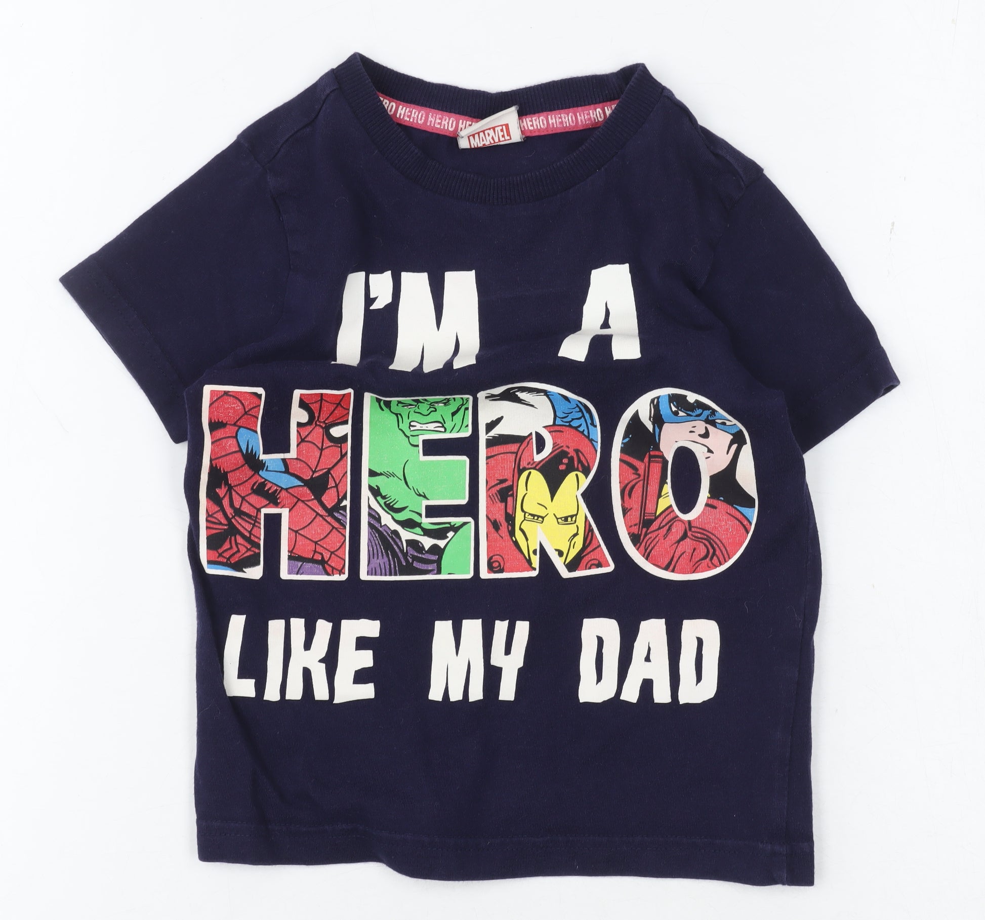 Unleash your inner superhero with this lively Marvel Boys T-Shirt, perfect for young fans of the legendary comic universe. Designed in a vibrant blue, this shirt features a bold 'I'm a Hero Like My Dad' graphic, showcasing beloved Marvel superheroes like Spider-Man, Hulk, and Captain America. It's crafted from 100% cotton jersey, making it soft and comfortable for everyday wear. Short sleeves and a classic crew neck add to the relaxed fit, suitable for any casual occasion. This garment is machine washable, making it easy to care for, and it comes brand new with tags attached. Ideal for boys aged 2-3 years, this shirt is a delightful addition to any Marvel enthusiast's wardrobe. Whether it's a day at school, a play date, or just hanging out at home, this T-shirt provides a fun and spirited way for kids to express their love for Marvel superheroes. The appealing design also makes it a great choice for gifting at birthdays or special occasions. Encourage imaginative play and heroic attitude with this engaging and colourful top.