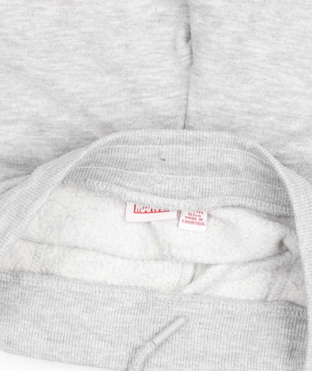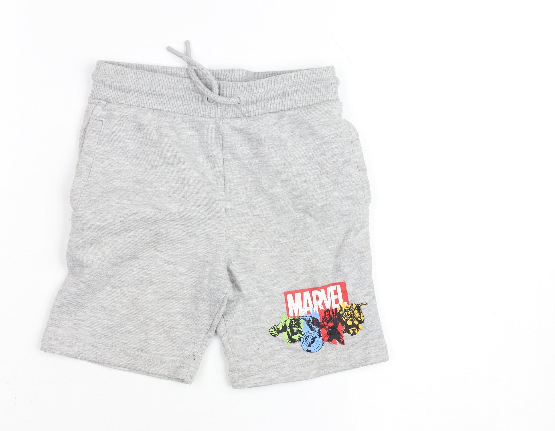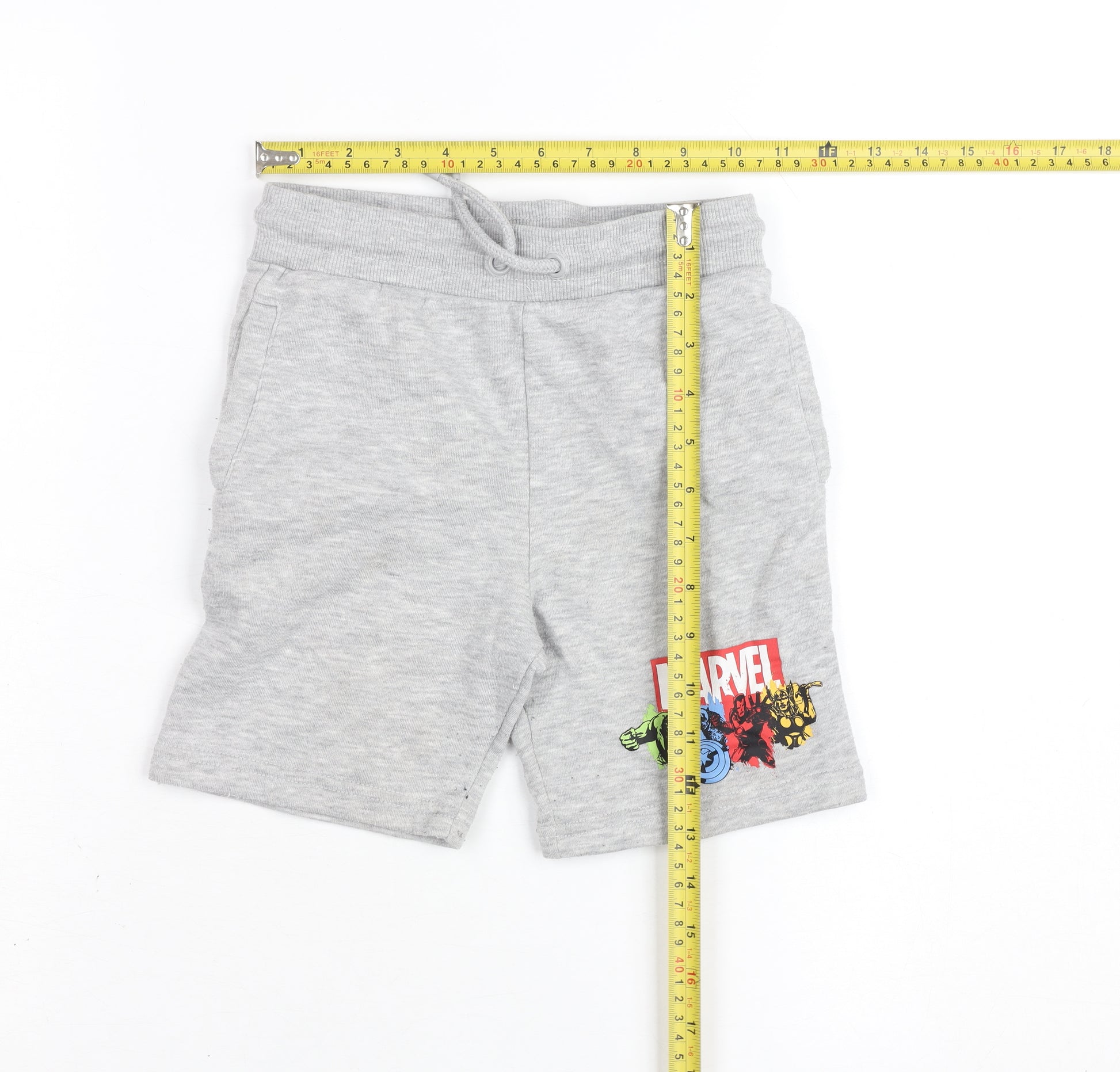 These Marvel boys' grey sweat shorts combine comfort, practicality, and superhero style that every fan will love. Crafted from a soft jersey blend of 60% cotton and 40% polyester, these shorts offer a breathable and lightweight feel, perfect for everyday wear during spring and summer months. The fleecy interior provides extra comfort, while the elastic waistband and adjustable drawstring ensure a secure and flexible fit ideal for active days or lounging at home.Featuring the colourful and iconic Marvel logo graphic along with well-loved characters including Hulk, Captain America, Iron Man, and Thor, these shorts bring a fun comic-inspired touch to any casual outfit. Two handy side pockets add practicality, allowing space to store essentials while maintaining a stylish look. The flat front design and regular fit create a neat silhouette that pairs easily with t-shirts or hoodies.These shorts are machine washable, making them low maintenance for busy parents. Despite being pre-owned, they remain in very good condition with minimal signs of wear and no damage to the print or fabric. Their neutral grey shade makes them easy to coordinate with a range of colours and outfits, while the soft sweat material keeps them comfortable for all-day wear.Ideal for casual wear, school breaks, sports practice, or weekend adventures, these Marvel shorts will quickly become a go-to favourite for any young superhero fan. Premium comfort, practical design, and a bold dose of character make these shorts a fantastic choice to add to their wardrobe – whether for home, play, or outdoor fun. A must-have for any boy who loves Marvel heroes!
