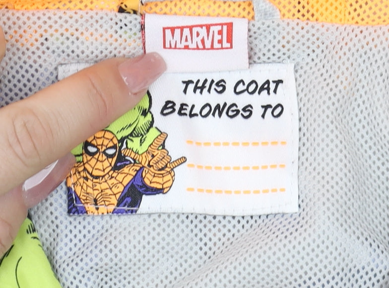 Make rainy days fun again with this colourful Marvel boys’ rain coat that features all-time favourite superheroes from the Marvel Universe. Designed for little fans of action and adventure, this lightweight, hooded jacket brings exciting characters like Captain America, Spider-Man, Hulk, and Iron Man to life in a bold multicoloured comic-style print that kids will love to wear. Made from a durable and water-resistant 100% polyester outer shell, this coat provides great protection from light rain and wind, making it ideal for the unpredictable British weather.The jacket includes a soft polyester mesh lining for added comfort and breathability, while the bright yellow zip fastening makes it easy for small hands to use. With its practical hood, long sleeves, and easy-care, machine-washable design, this coat ensures fuss-free wear for busy school mornings or outdoor play. The inner tag allows you to write your child's name, making it perfect for school or nursery use. Its relaxed, regular fit allows layering over jumpers or sweatshirts, offering versatility across spring and autumn seasons.Parents will also appreciate the safety-conscious and functional details—elasticated cuffs help keep out drizzles, and the lightweight structure ensures comfort without bulk. This Marvel boys’ raincoat combines practicality with exciting style, making it an excellent wardrobe staple for any young superhero fan. With a well-cared-for condition showing no visible marks or wear, this jacket offers great value for families looking for quality and style at an affordable price.Ideal for casual outings, school runs, or weekend adventures, this playful and practical raincoat is guaranteed to bring a smile to your little hero’s face every time they step out the door. Give them the confidence to take on any adventure—rain or shine—while showing off their favourite Marvel legends.