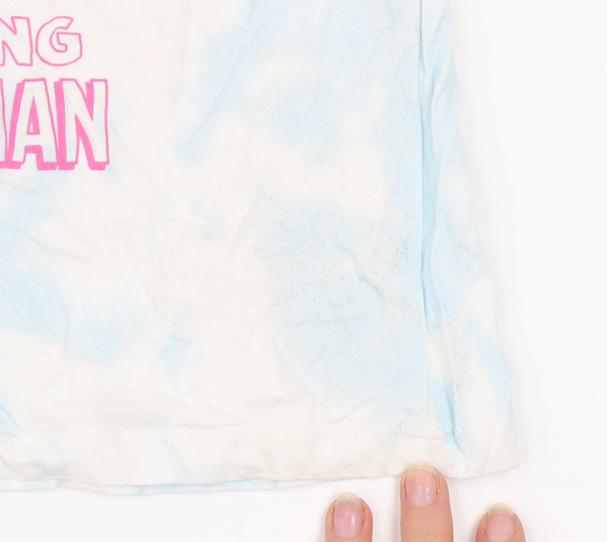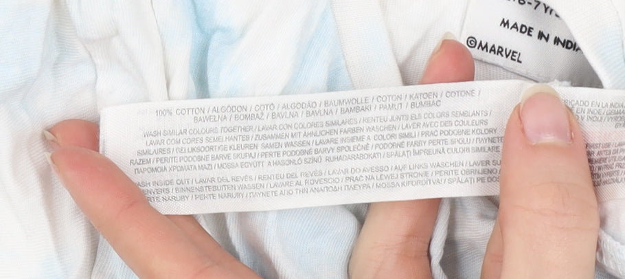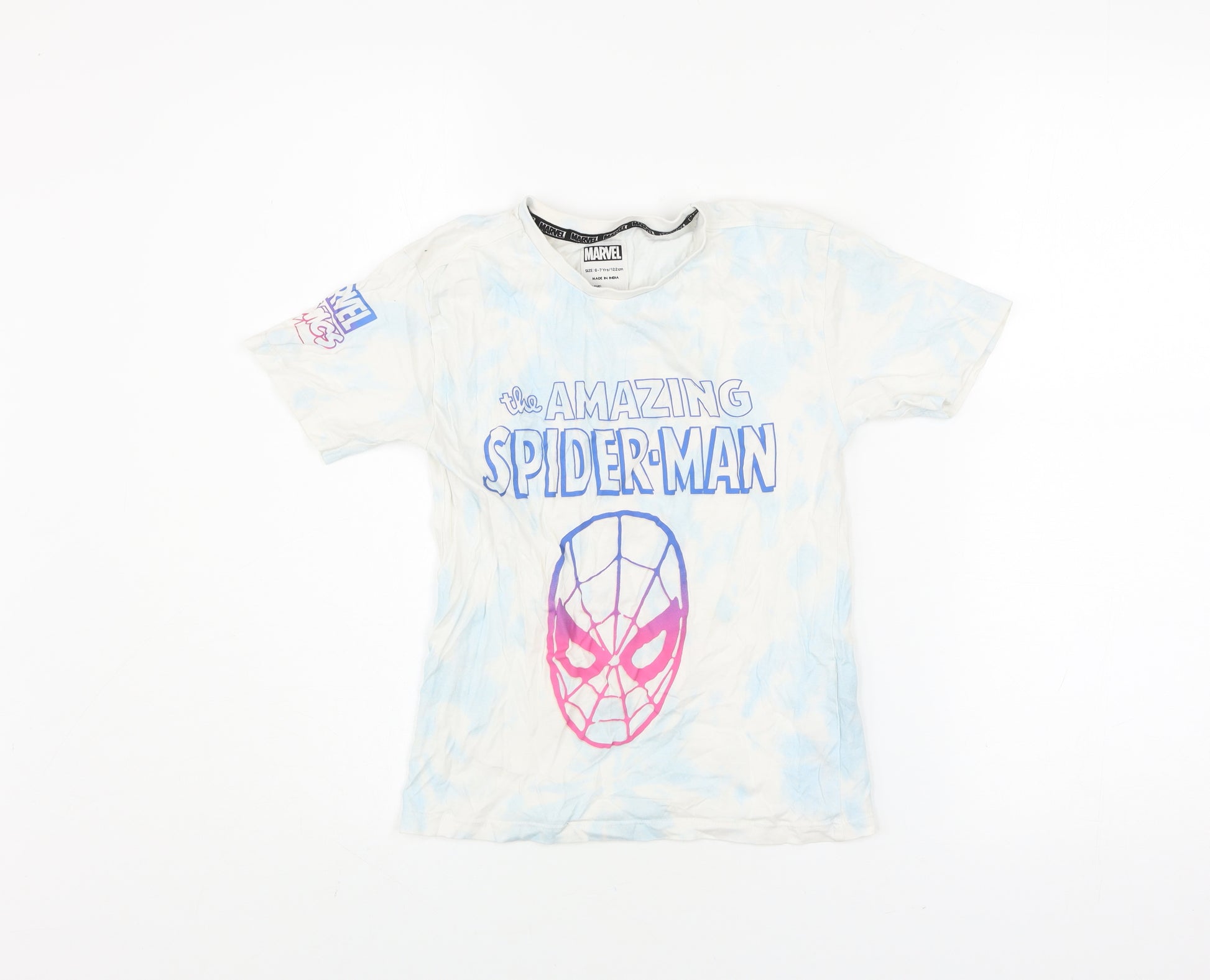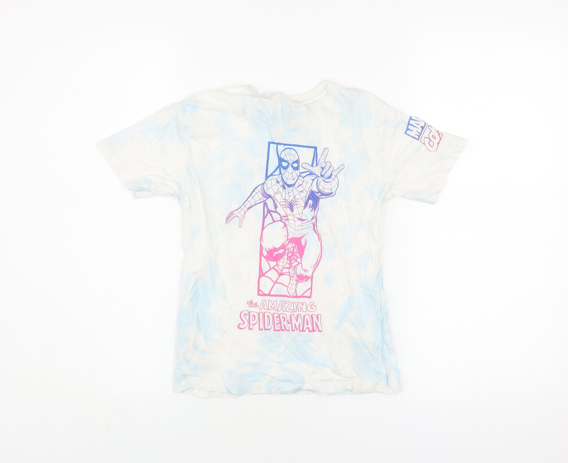 This Marvel Boys Spider-Man T-Shirt is perfect for young superhero fans. Featuring the iconic 'The Amazing Spider-Man' design, this colourful tee captures the fun and excitement of the classic comic book hero. Crafted from 100% cotton, it offers a soft and breathable feel, ensuring comfort throughout the day whether lounging at home or playing with friends. The shirt showcases a tie-dye inspired blend of light blue and white tones, with bold graphic prints on both the front and back, making it a standout piece for any casual wardrobe. Designed in a regular fit with short sleeves and a classic crew neckline, this T-shirt provides ease of movement and a laid-back style. The lightweight jersey fabric makes it ideal for summer wear, while the pullover design offers quick and easy dressing for busy mornings. Perfect for pairing with jeans or shorts, it brings playful charm to everyday outfits. Although gently used, the T-shirt remains in good overall condition, showing some light discolouration near the hem but no major flaws. It’s an affordable and stylish way for any young fan to show off their love for Spider-Man and the Marvel Universe. Ideal for casual occasions, summer adventures, or themed events, this fun and vibrant top will quickly become a favourite. Machine washable for easy care, it’s practical as well as cool. A great choice for parents seeking quality licensed character fashion at an excellent value. Bring home the mighty power of Spider-Man with this bold and dynamic Marvel T-Shirt.