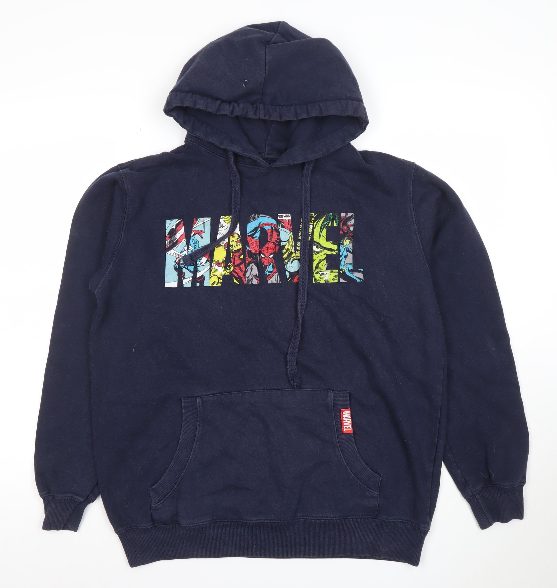 Add a bold touch to your off-duty wardrobe with this officially licensed Marvel men’s pullover hoodie. Crafted in a deep navy blue tone, it features a striking multi‑coloured Marvel logo graphic across the chest showcasing iconic comic‑book heroes such as Spider‑Man, Iron Man, the Hulk, and Thor. Designed in a regular fit with a cosy fleece fabric blend of 65% cotton and 35% polyester, the hoodie provides excellent comfort, warmth, and durability. The drawstring hood and ribbed cuffs keep out the chill, while the front kangaroo pocket adds casual practicality for everyday wear. Perfect for cooler seasons like autumn, winter, or early spring, it pairs effortlessly with jeans or joggers for relaxed weekends, gaming sessions, or outings with friends. The soft fleece interior and breathable construction make it suitable for all‑day comfort whether lounging indoors or layering up outdoors. This versatile hoodie captures both casual streetwear flair and fan appeal, making it ideal for Marvel enthusiasts or anyone who loves standout comic-inspired looks. The detailed print maintains sharp colours and crisp lines, giving the piece a premium touch. Free from major flaws, it’s in very good pre‑owned condition with only minimal signs of wear such as light lint. Machine washable for easy care, this hoodie will remain a reliable go‑to for both style and comfort. Whether worn to represent your favourite heroes or simply to stay comfortably warm, this Marvel hoodie will quickly become your wardrobe staple. A great choice for comic fans, everyday wearers, or as a thoughtful gift for a Marvel enthusiast.