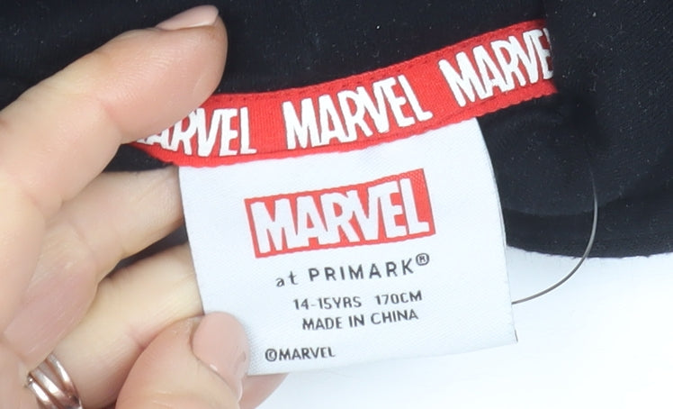 Bring comic book action to life with this officially licensed Marvel Spider-Man hoodie for boys. Designed by Marvel in collaboration with Primark, this striking pullover hoodie features a bold black base with vivid Spider-Man and Marvel graphic prints across the front and back, adding instant superhero energy to any outfit. Perfect for fans of the iconic web-slinger, this hoodie combines style and comfort in one heroic package. Crafted from a soft cotton and polyester blend, it provides breathable warmth and lasting wear for all-day adventures. The hoodie includes a classic hooded neckline and ribbed cuffs and hem for a cosy fit, while the roomy kangaroo pocket adds practicality for hands or essentials. It’s ideal for layering over a t-shirt on chilly school days, weekends out, or relaxed lounging at home. The bold Marvel logo across the chest and graffiti-style Spider-Man design at the back make this a standout wardrobe staple that young fans will love wearing again and again. Designed for boys aged 14-15 years (approx. 170 cm), this pullover hoodie ensures both comfort and movement for growing teens. With its machine washable, easy-care fabric, parents can appreciate its fuss-free maintenance. Whether worn with jeans, joggers, or shorts, this Marvel hoodie brings a sense of fun and fandom to any casual look — a great gift for Spider-Man fans who want to show off their favourite superhero in style. Conditioned as excellent, this hoodie is free from tags but in clean, well-kept shape. Snap up this comic-inspired classic for the modern Marvel enthusiast.