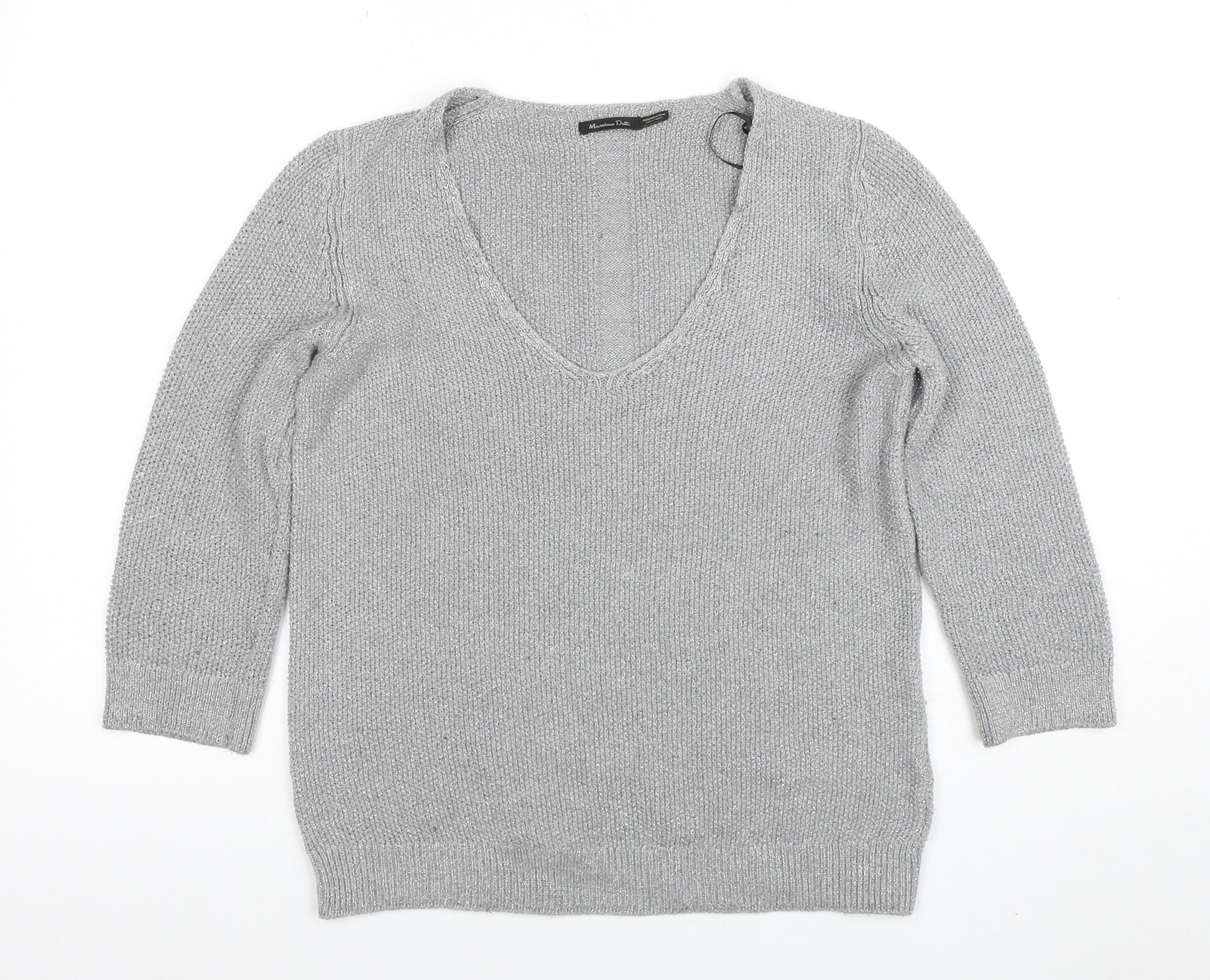 Add an effortlessly elegant touch to your wardrobe with this stylish women’s grey jumper from Massimo Dutti. Crafted from a soft cotton blend with a hint of metallic fibre, this piece perfectly combines comfort and contemporary appeal. The lightweight knit makes it ideal for layering through the cooler seasons, while the shimmering thread adds a subtle, sophisticated finish suitable for both casual and semi-formal occasions. The design features a flattering V-neckline that complements the natural drape of the fabric and enhances your silhouette with timeless simplicity. Its 3/4-length sleeves lend an easygoing touch, making it versatile enough for day-to-evening wear. The ribbed trim at the hem and cuffs ensures a polished fit that maintains structure over time. Designed for comfort with a regular fit, this jumper pairs beautifully with tailored trousers, skinny jeans, or a chic midi skirt for an effortlessly put-together look. Whether you’re dressing for work, a relaxed weekend gathering, or a smart casual event, this jumper will add refined style to any outfit. In excellent pre-owned condition with only the lightest signs of gentle wear, this high-quality piece upholds Massimo Dutti’s reputation for timeless luxury and exceptional craftsmanship. Ideal for autumn and spring layering, it’s a versatile wardrobe essential for women who value understated elegance and comfort. Machine washable for easy care and designed to remain a reliable style staple season after season, this lovely V-neck jumper makes an excellent addition to your collection or a thoughtful gift for someone who appreciates fine knitwear.