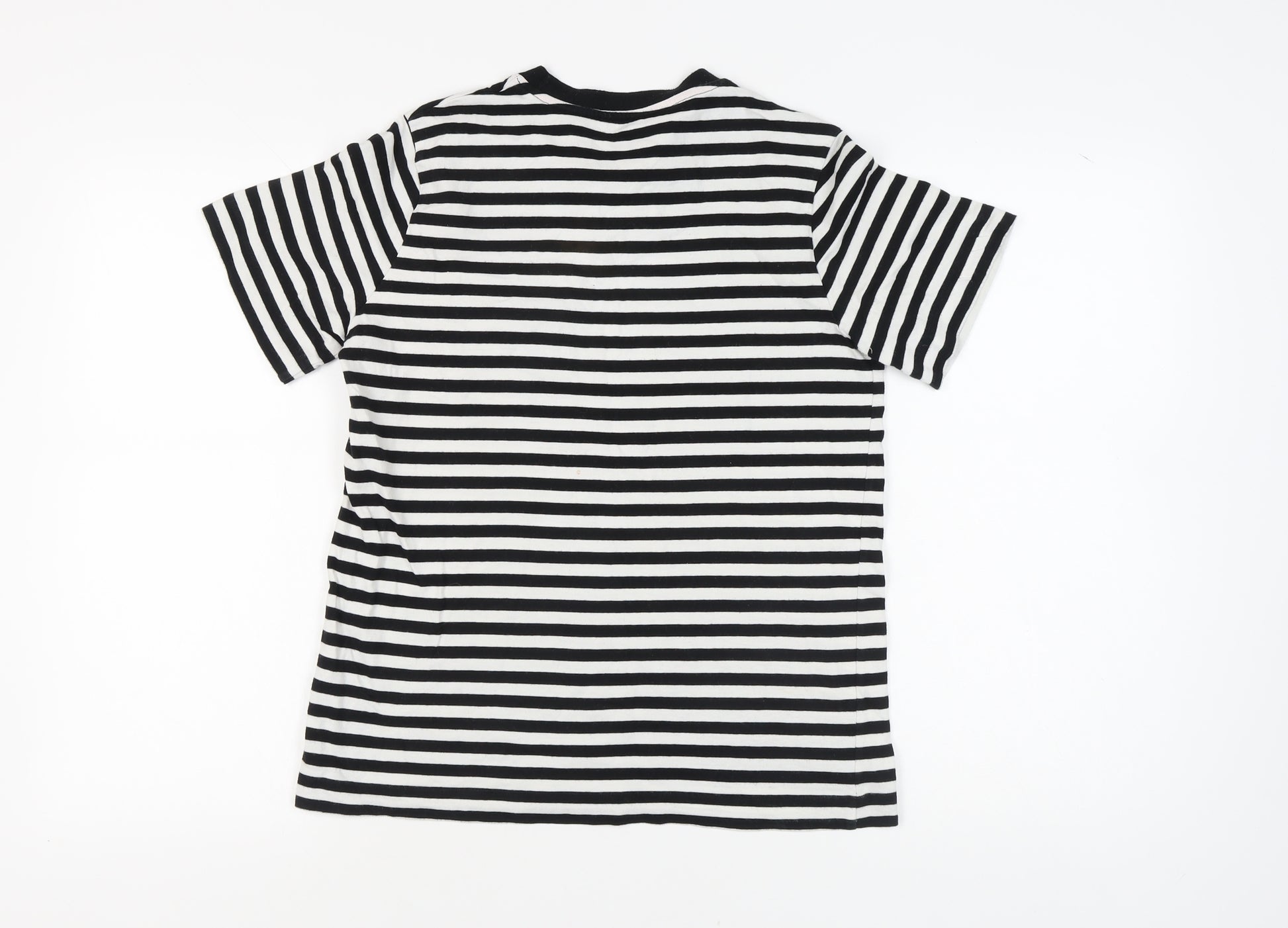 Step into a world of chic simplicity with this elegant Massimo Dutti Women's Black Striped T-Shirt. Tailored for those who embrace a timeless style, this regular fit top combines a classic ringer design with a contemporary flair. Crafted from premium cotton jersey, it ensures lasting comfort and breathability, making it ideal for all-day wear. The black stripes add a sophisticated touch, suiting every casual occasion effortlessly.Featuring a crew neck and short sleeves, this T-shirt provides a relaxed yet polished look. Its neatly accented pocket brings an additional layer of style, enhancing its casual charm. Whether paired with jeans for a laid-back outing or layered under a jacket for a more refined appearance, this versatile piece adapts to your personal style seamlessly.Made with attention to detail and premium materials, this T-shirt is easily machine washable, adding convenience to your wardrobe care routine. Although gently worn, it remains in excellent condition without any visible wear or tear marks. Perfect for those who value understated elegance, this Massimo Dutti T-shirt is a must-have addition to your collection. Enjoy this stylish essential that promises both comfort and fashion, priced at just £12.00.