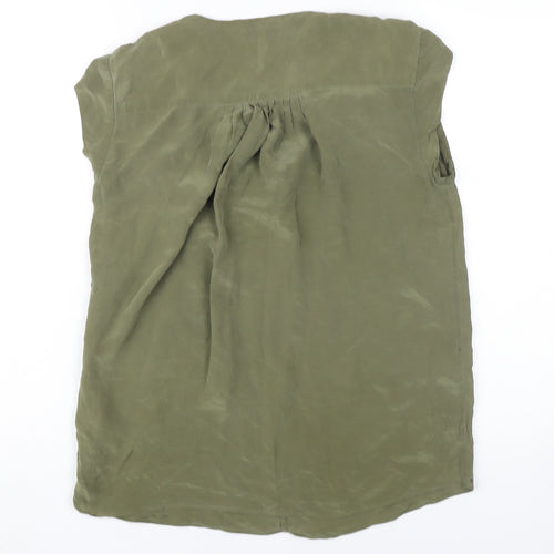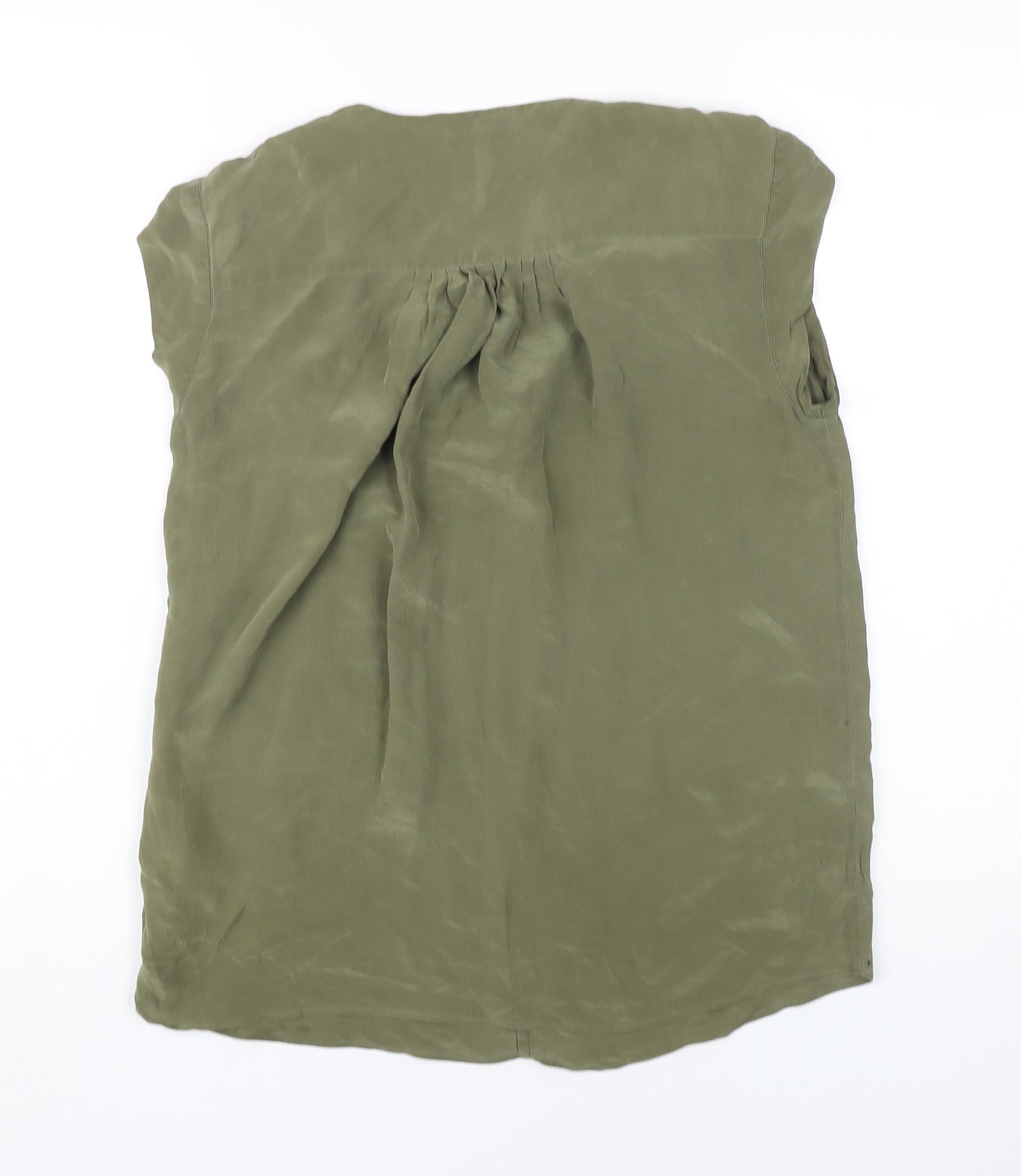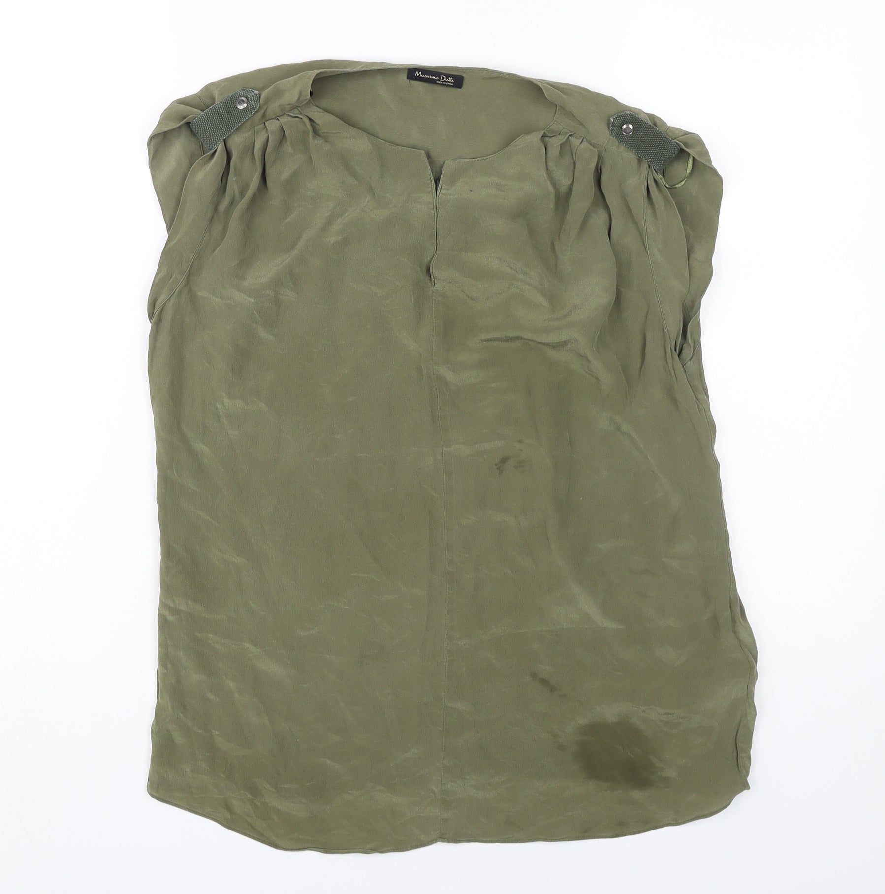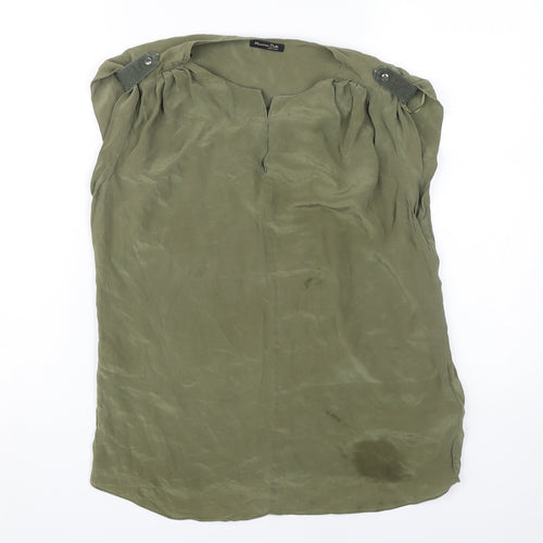 Elevate your casual wardrobe with this elegant Massimo Dutti blouse. Crafted from exquisite silk, this top exudes luxury and comfort, making it perfect for warm summer days. Its rich green hue offers a versatile style that can be dressed up or down effortlessly. Featuring a classic V-neckline and sleeveless cut, this blouse is designed to flatter while keeping you cool and comfortable. The button accents add a touch of sophistication, while the pullover closure ensures ease of wear. Despite being in excellent condition, there is a minor stain on the front, reflected in its competitive price. Whether paired with chic trousers or casual jeans, this blouse will quickly become a favourite in your wardrobe. Don’t miss out on adding this timeless piece to your collection.