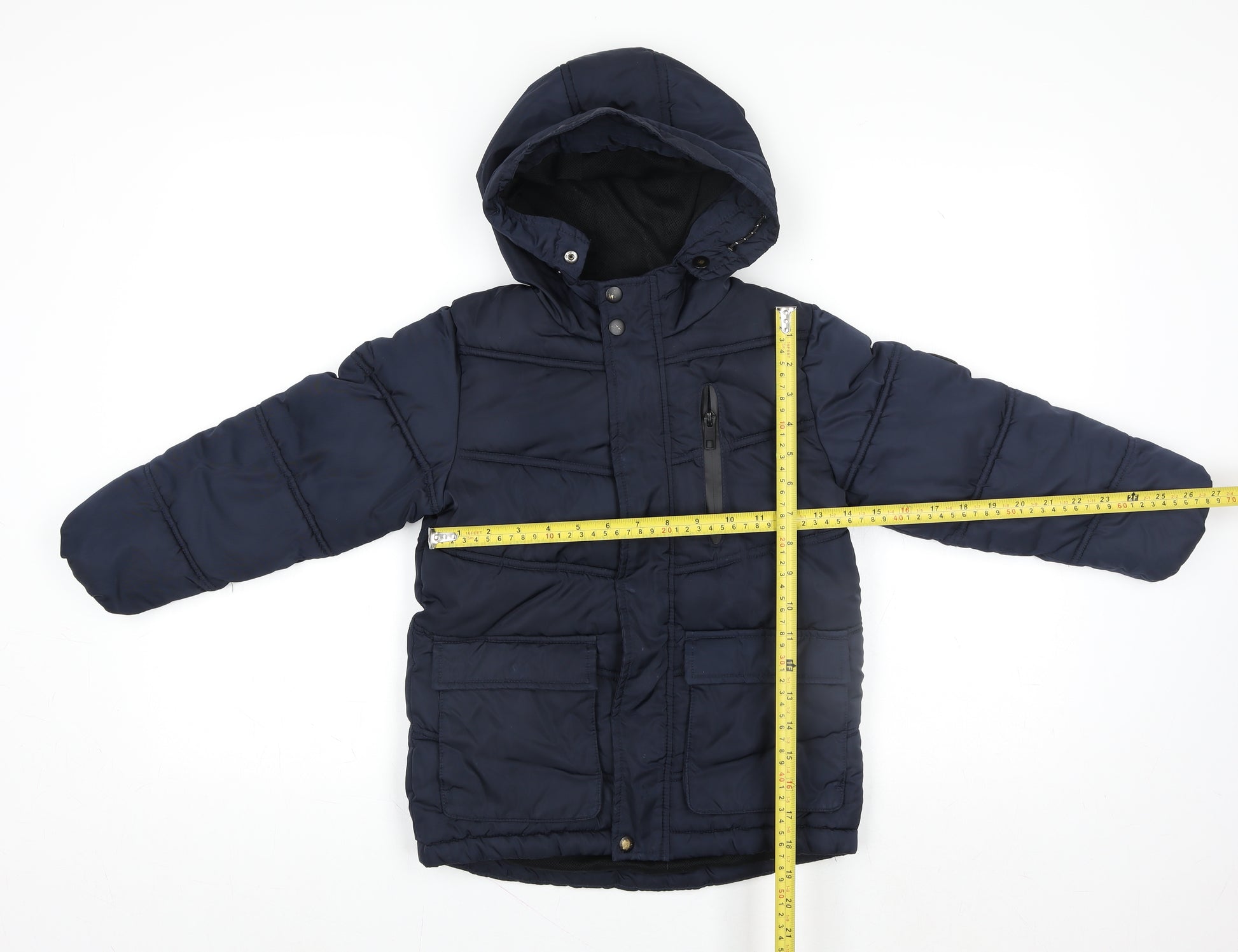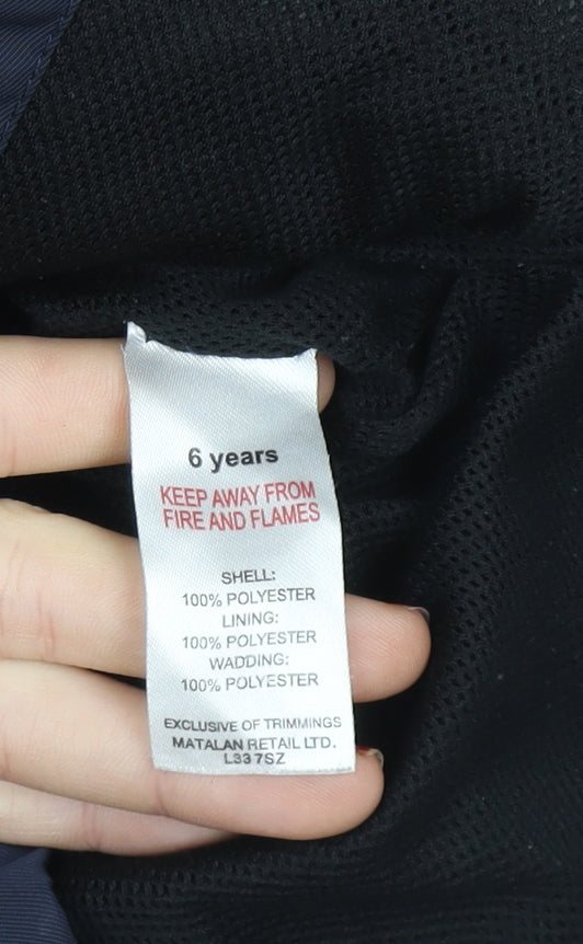 Get your little one ready for chilly days with this cosy Matalan Girls Blue Puffer Jacket in size 6 Years. Designed for warmth and comfort, the jacket features a padded, quilted shell made from 100% polyester with soft polyester lining and wadding for extra insulation. Perfect for school runs, weekend adventures, or everyday wear during the colder seasons, it offers both practicality and style.The mid-length cut ensures extra coverage, while the hood provides protection from wind and light rain, making it ideal for winter and autumn. Featuring a full zip fastening concealed with snap buttons, this coat is easy to slip on and off. Handy front pockets and a secure chest zip pocket provide plenty of space to keep hands warm or store small essentials. The dark blue colour makes it versatile and easy to pair with any outfit.Crafted from durable woven polyester, this jacket is designed to resist wear and tear while offering a soft, comfortable feel. It’s machine washable for easy care and features the classic Matalan quality you can trust. With a subtle quilted texture and regular fit, it delivers a timeless look that keeps your child stylish and snug throughout the colder months.Ideal for daily wear, school, or outdoor activities, this jacket combines function and fashion effortlessly. Whether layered over a hoodie or worn with a school uniform, it’s the perfect winter essential for keeping warm without compromising on comfort. The clean design and practical features make it a must-have addition to any young girl's outerwear collection. Embrace reliable warmth and durability with this versatile girls’ puffer jacket from Matalan, built for both play and everyday adventures.