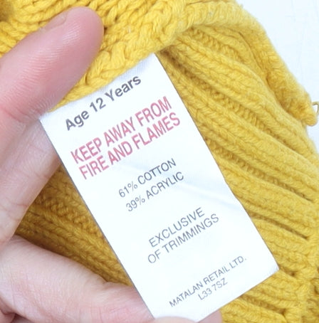 Brighten up your child’s wardrobe with this cheerful girls’ yellow cable knit pullover from Matalan, designed for comfort and style. Made from a soft blend of 61% cotton and 39% acrylic, this jumper offers a cosy yet breathable feel, keeping your child comfortable for any occasion. The mock neck design adds a modern touch while helping to keep in warmth, making this a practical choice for cooler autumn and winter days.The jumper features a classic cable knit pattern with added bobble accents, which gives it both texture and character. Its long sleeves and ribbed hem provide a snug fit, while the bold yellow colour makes it a fun, standout piece ideal for both casual wear and party dressing. Measuring approximately 38 cm in length, it sits at a versatile cropped style that looks fantastic paired with jeans, leggings, or skirts.Designed for age 12 years, this jumper falls under the girls’ department but has a versatility that could suit many occasions. Whether worn for school, a playdate, or a family outing, it offers stylish comfort that appeals to both children and parents alike. The pullover style allows for simple dressing, and being machine washable, it is easy to care for and maintain.Although it doesn’t include original sales tags, the jumper is in excellent condition with no signs of wear, ensuring plenty of life left for its new owner. The vibrant yellow shade makes this a perfect option for brightening up gloomy days while keeping warm.Overall, this Matalan girls' jumper is a fashionable, practical, and comfortable choice that is sure to become a wardrobe favourite. Combining playful design with everyday wearability, it’s both eye-catching and versatile, making it a great addition to any young girl’s collection.