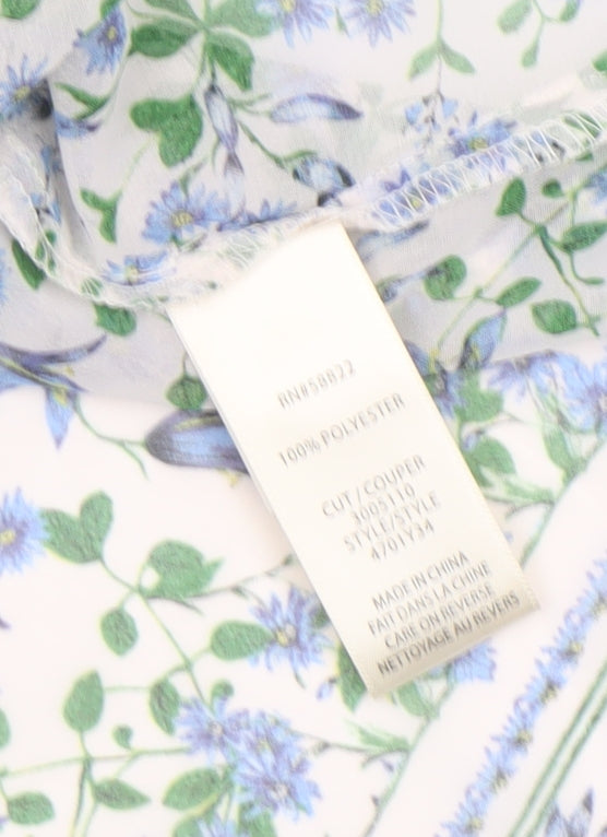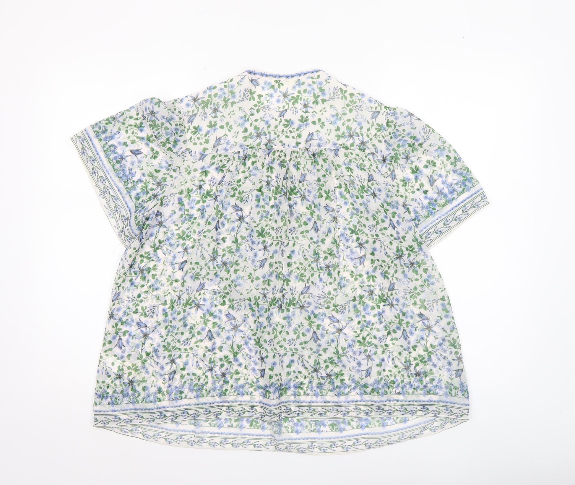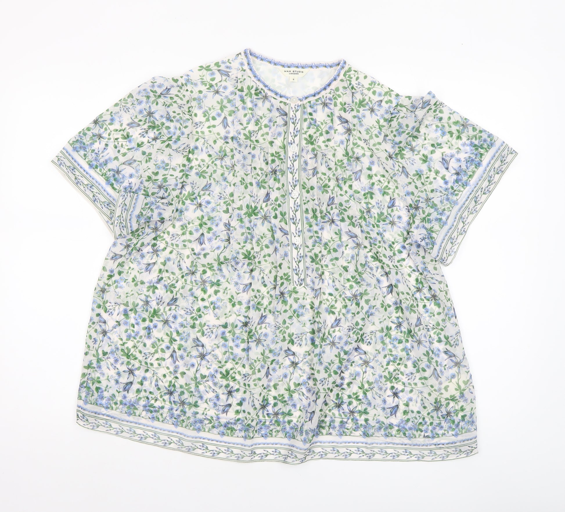 This elegant Max Studio London women's blouse effortlessly combines a classic floral design with a light and airy fabric that’s perfect for warmer days. Crafted in 100% polyester chiffon, the blouse is soft, breathable, and fluid with a flattering drape that enhances its relaxed tunic silhouette. The multicoloured floral pattern in soft hues of blue, green, and white adds a refreshing feminine charm, while delicate details like the buttoned front placket and rounded crew neckline give it a timeless appeal.Designed with short sleeves and a loose fit, this blouse offers comfort and versatility, making it an ideal choice for casual outings, spring walks, or summer holidays. The breathable fabric ensures effortless wearability, while the floral motif adds a touch of sophistication suitable for layering under cardigans or pairing with tailored trousers or jeans. Thoughtfully finished with printed border detailing on the sleeves and hem, this tunic-style piece subtly enhances any outfit with an understated, bohemian-inspired flair.Whether worn with light denim for a weekend look or with smart layering for a daytime event, this Max Studio London blouse offers both style and comfort. Perfect for the woman who appreciates elegant prints and easy-to-wear wardrobe staples, it provides a lifted casual aesthetic that transitions beautifully from day to evening. In excellent pre-owned condition, it shows minimal signs of gentle wear and remains in wonderful shape. A summer essential that’s both stylish and breezy, ideal for the modern woman seeking effortless sophistication and timeless floral charm.