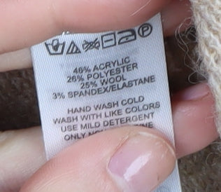 Experience the chic elegance of the Max Studio Women's Beige Cape Jumper in Size M, expertly crafted for both style and comfort. This versatile piece features a sophisticated cowl neck design, perfect for adding a touch of glamour to your casual ensemble. The lightweight, tight-knit fabric ensures a comfortable fit, ideal for layering during the cooler autumn and winter months.Made from a carefully selected blend of acrylic, polyester, wool, and elastane, this jumper provides warmth and durability, ensuring it will remain a staple in your wardrobe for seasons to come. With its timeless cape style and charming button accents, it offers a unique silhouette that stands out while remaining understated.The soft beige hue complements any outfit, making it the perfect addition for those seeking a versatile garment that transcends seasonal trends. Whether you're dressing for a casual outing or wanting to elevate your everyday wear, this jumper offers the perfect balance of function and aesthetics.An ideal choice for the fashion-conscious woman, this piece is easy to care for with hand wash maintenance, ensuring its fabric remains impeccable. Elevate your collection with this exquisite jumper, and experience the perfect blend of modern style and traditional craftsmanship.