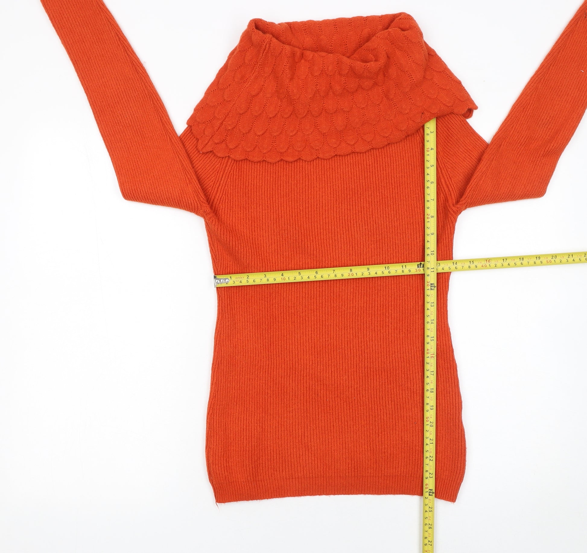 Add a vibrant touch to your seasonal wardrobe with this beautiful MC Lorene women's orange knit jumper. Made from a soft and comfortable blend of viscose and polyester, this jumper offers warmth without bulk, making it ideal for layering throughout the cooler months. The striking cowl neckline creates an elegant silhouette that beautifully frames the shoulders, while the tight-knit ribbed texture provides a snug yet flattering fit for everyday comfort.Designed in a bold orange shade, this jumper delivers a modern statement look that can effortlessly transition from daywear to a casual evening ensemble. The long sleeves and regular fit make it practical for autumn and winter wear, while the lightweight feel ensures breathability and ease of movement. Whether paired with jeans for a relaxed daytime outfit or with a skirt and boots for a smart-casual style, this versatile piece adds warmth and a pop of colour to any look.The soft rib-knit construction gives a classic texture, complemented by a subtle scalloped patterned detail around the neckline for a touch of sophistication. Crafted for all-day wear, this MC Lorene jumper is perfect for women seeking a chic yet easygoing staple. The blend of materials ensures durability and comfort, with viscose providing a smooth, naturally breathable finish and polyester adding shape retention and strength.Condition is very good with a small mark near the front collar, but overall the garment remains in great shape with no tears or major flaws. As a one size fit, it comfortably suits a range of body shapes and lends itself well to relaxed weekend styling or layering on chilly days.Charming, comfortable, and stylishly simple, this MC Lorene orange cowl neck jumper is a timeless addition to any wardrobe that brings both warmth and personality to your autumn and winter outfits.