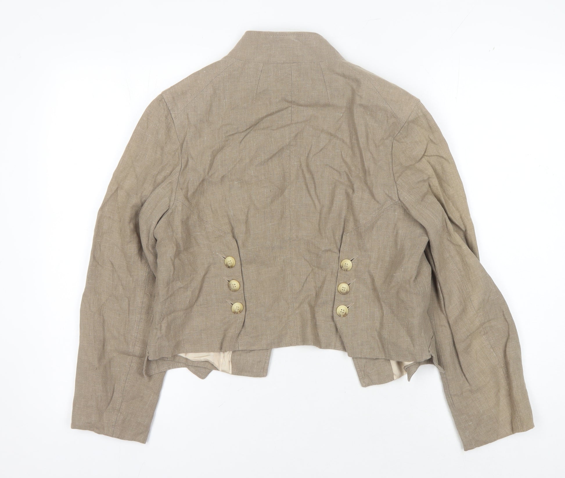 Discover elegance with this McGregor Women's Cropped Linen Jacket, tailored in a size 10. Its beautiful beige tone offers a versatile appeal to various outfits, perfect for casual summer outings. Crafted from high-quality linen, this jacket provides comfort and breathability, making it ideal for warm weather. The classic button accents add a refined touch, whilst the long sleeves provide a nicely balanced coverage. Despite being pre-loved, the jacket holds an excellent condition with mere minor creasing visible that can be easily flattened. The jacket features an acetate lining, known for its smooth and silky feel against the skin. Treated with a regular fit, it promises a pleasantly comfortable wearing experience. This jacket, equipped with button closure, makes for effortless dressing and styling. Its cropped length design adds a chic appeal, while remaining in line with timeless fashion trends. Embrace this piece as a statement of understated sophistication, ready to enhance your wardrobe with ease and elegance. Whether it's a casual meet-up or a relaxed day out, this jacket can be the perfect companion. Dry clean only to maintain its charm. Snap up this stylish piece at an attractive price point today!