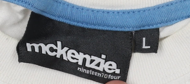 Discover the effortless style and comfort of this McKenzie Men's Graphic T-Shirt in crisp white. Crafted from 100% cotton, this jersey knit tee offers a classic crew neck and short sleeves, perfect for a casual, relaxed fit. The prominent graphic print and brand logo accents add an edgy flair, making it a versatile addition to your wardrobe for any season. Despite slight signs of wear, its machine washable feature ensures easy care, maintaining its pristine look. Satisfy your fashion needs with this reliable tee, ideal for daily wear or gifting this timeless piece.