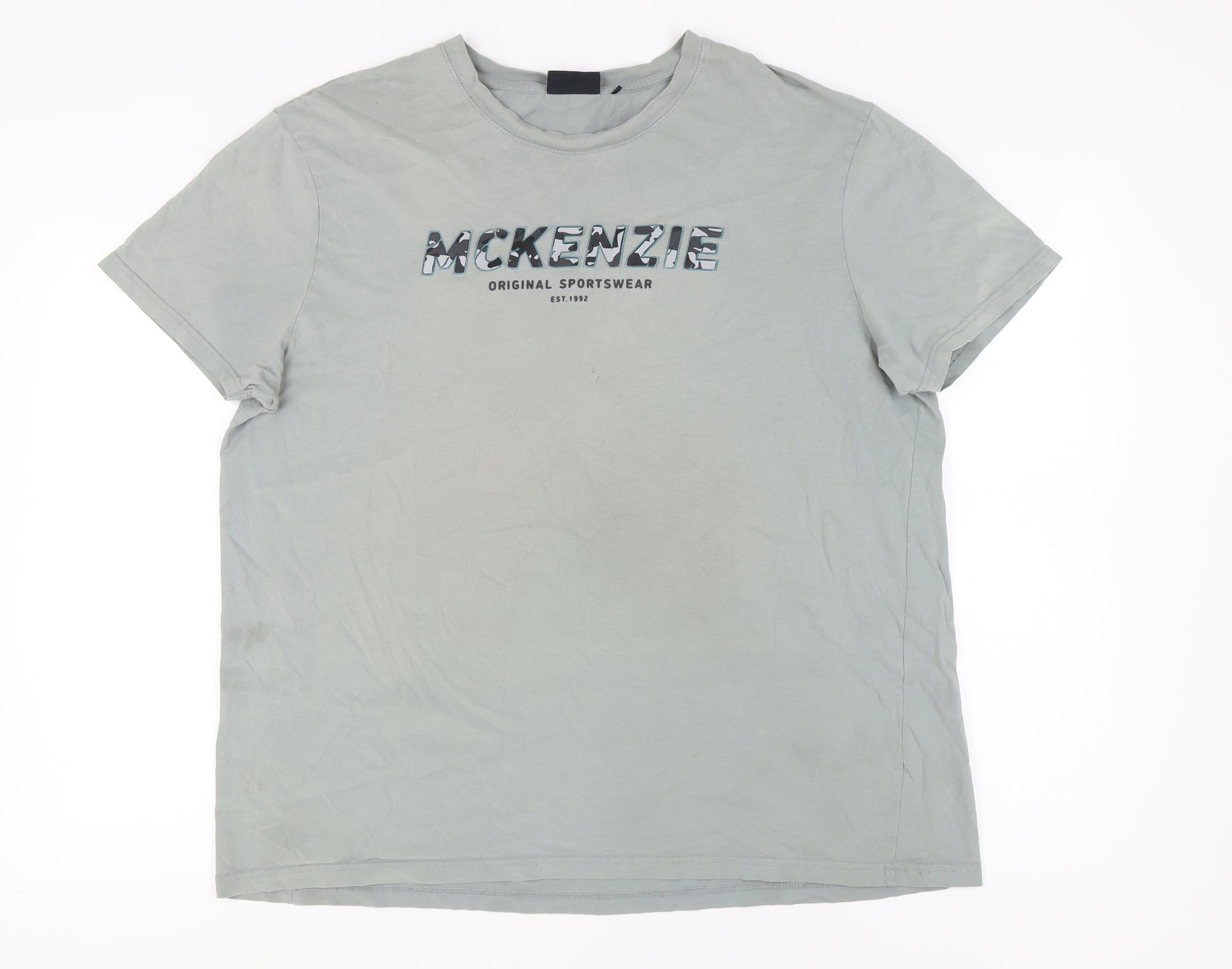 This McKenzie Men's T-Shirt, engineered from soft cotton, offers a blend of comfort and style. In a versatile grey hue, this 2XL tee is perfect for casual outings or relaxed home wear, easily complementing any wardrobe. Featuring a crew neck for a classic fit and short sleeves for optimal comfort, it keeps things simple yet stylish. The graphic print adds a touch of character, making this a standout piece in any casual wardrobe. Machine washable and suitable for all seasons, this T-shirt promises convenience without compromising on appearance. Despite minor blemishes, it remains in very good condition, ready to be a wardrobe staple.