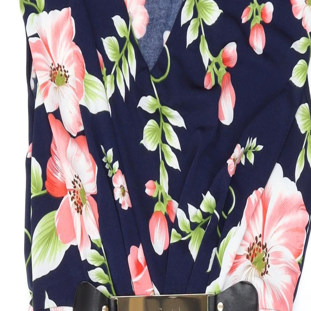 Womens Blue Floral Polyester A-Line Size 12 V-Neck Pullover