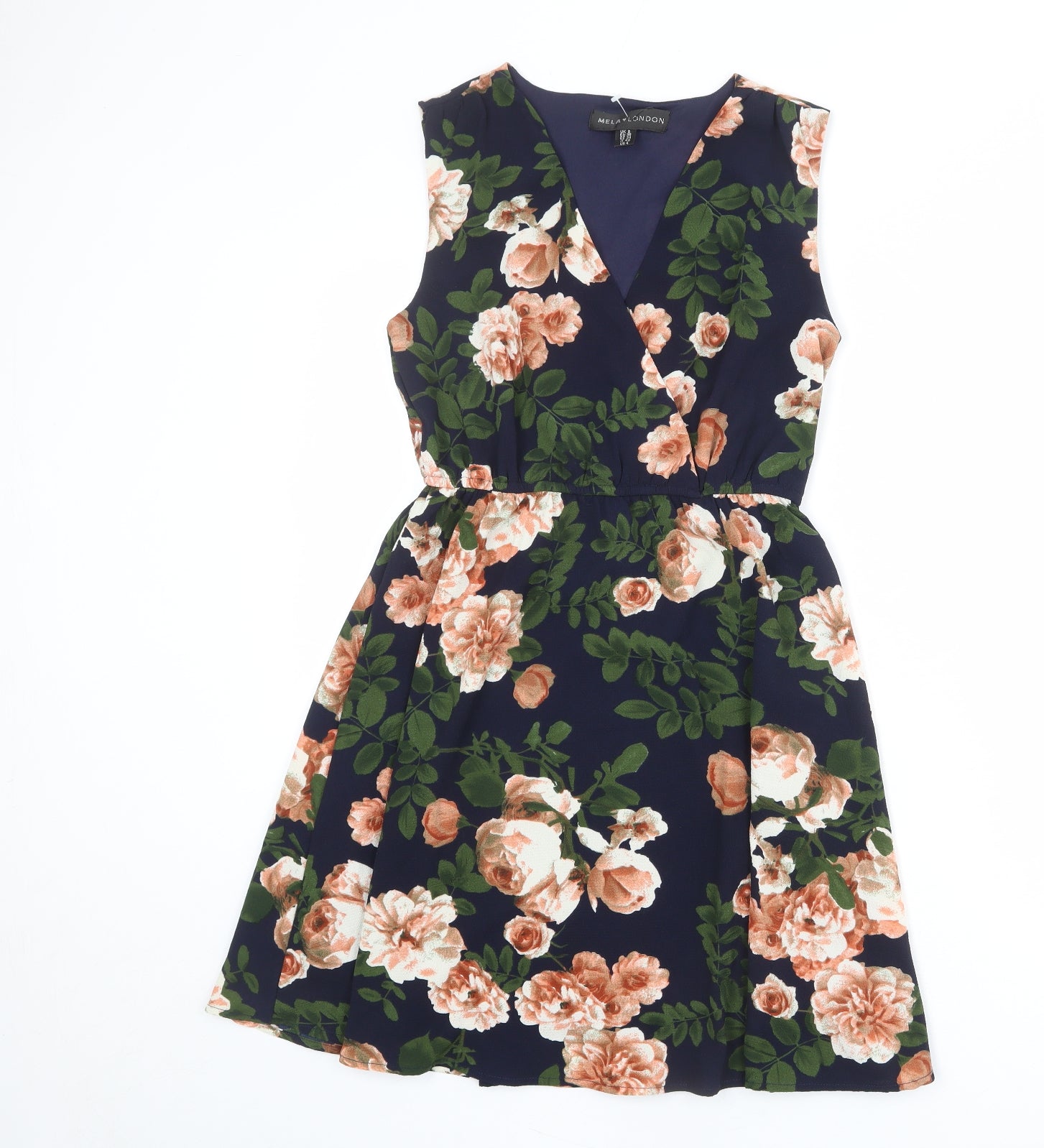 Marks and Spencer Womens Blue Floral Viscose A-Line Size 8 V-Neck Button