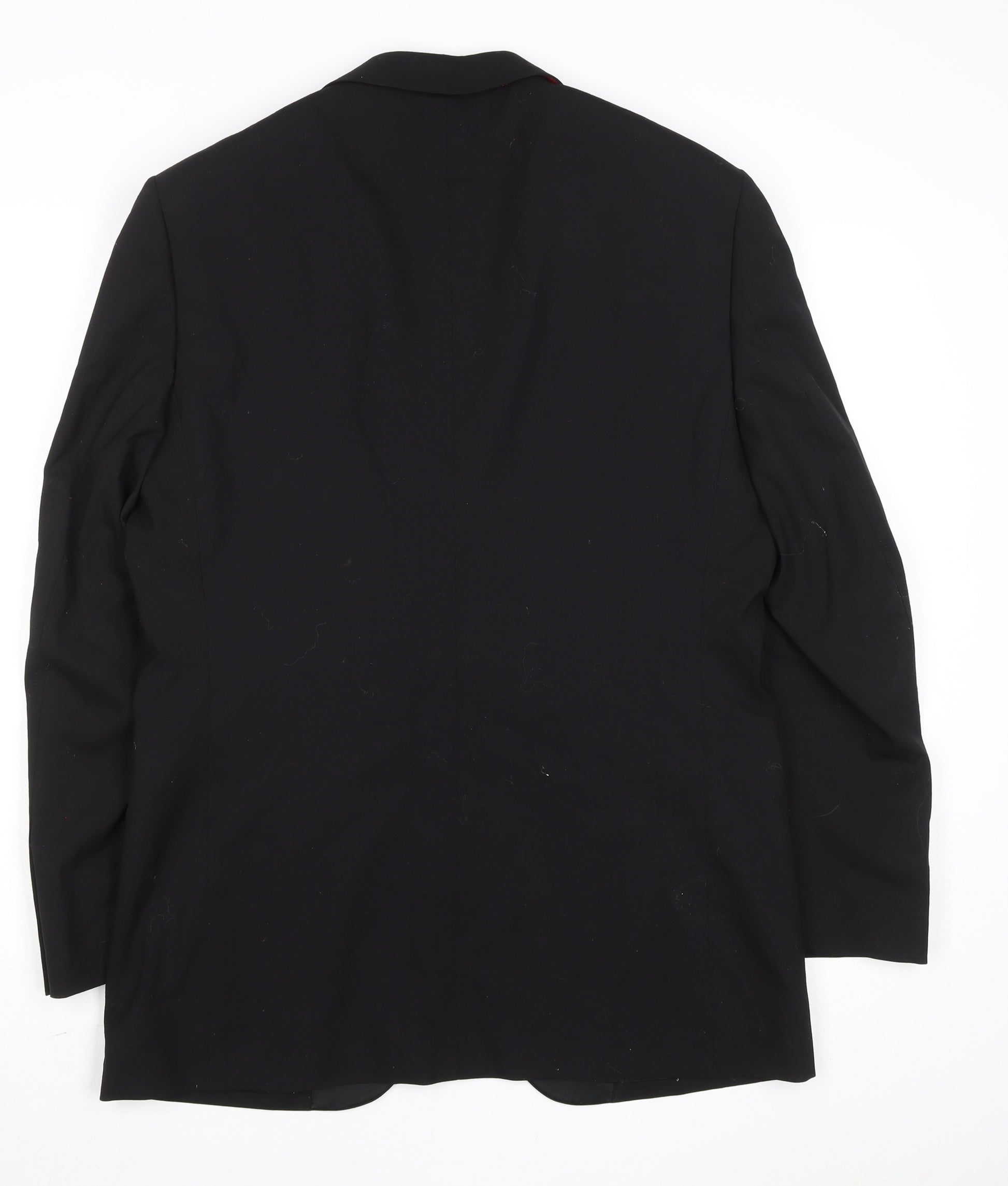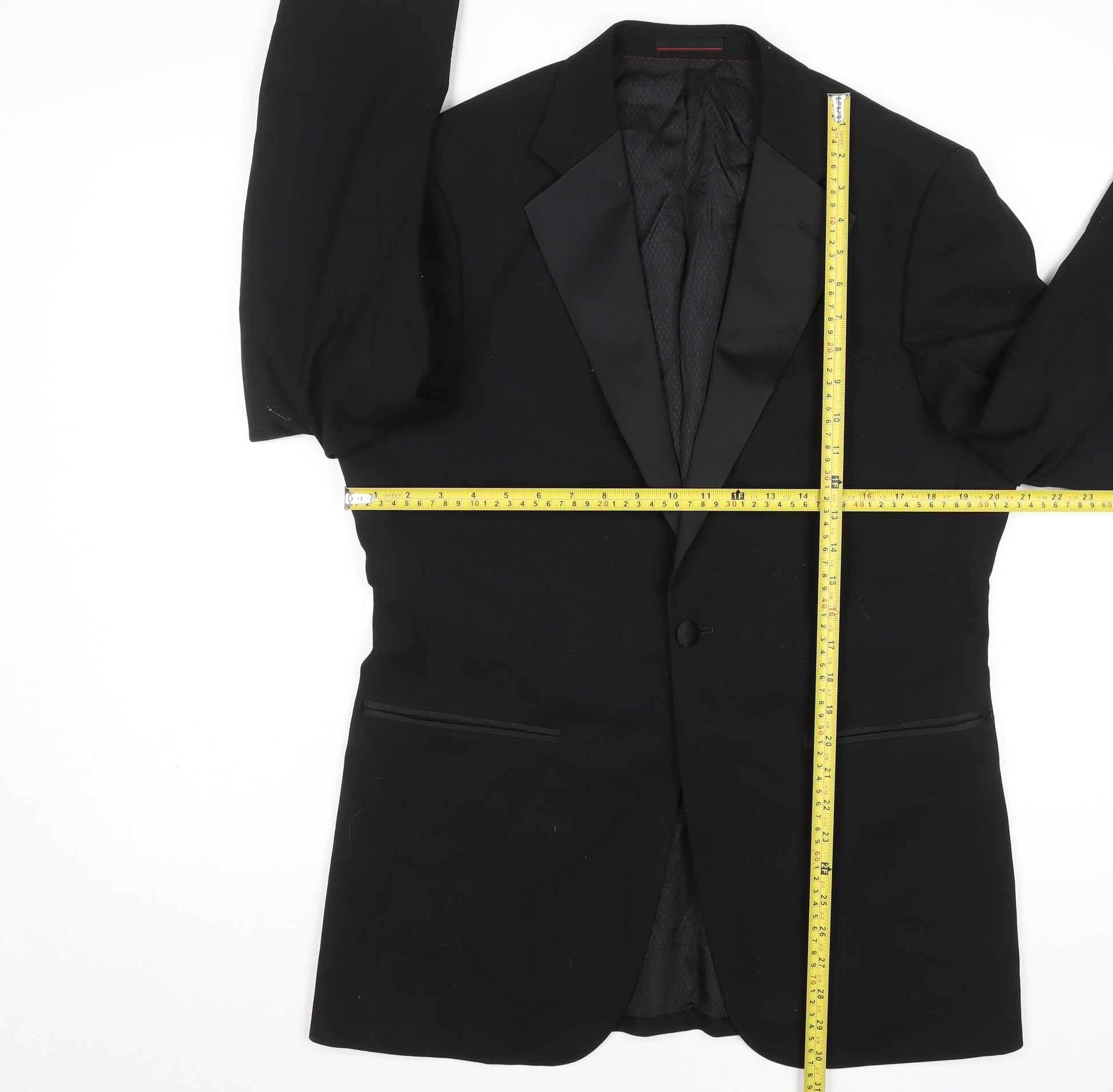 Step into effortless elegance with this sophisticated men’s black tuxedo jacket, designed to deliver enduring style for any formal occasion. Expertly tailored in a 38R regular fit, this jacket showcases a sleek single-breasted silhouette with a refined one-button front closure and a polished shawl lapel crafted from smooth satin for a touch of luxury. Made from a premium wool blend that includes 60% wool, 38% polyester, and 2% elastane, it balances comfort, flexibility, and breathability. The subtle elasticity ensures a sharp fit without compromising mobility, making it a reliable choice for extended wear during evening events or ceremonies. Its fully lined interior, using a blend of polyester and viscose, adds softness and durability while maintaining a refined drape. Two front welt pockets and a practical inner pocket complete the piece, providing both elegance and practicality. Perfect for weddings, black-tie events, or special celebrations, its timeless black hue offers easy coordination with classic white shirts, silk ties, and formal trousers. Designed for the modern gentleman who values both quality and comfort, this tuxedo jacket combines traditional tailoring with contemporary precision. With only minimal lint visible and no signs of major wear, the jacket is in excellent condition—ideal for those seeking a smart, gently used addition to their wardrobe. Whether worn with matching trousers or paired with contrasting tones for a modern twist, this jacket delivers a commanding yet effortless style. A distinguished piece that encapsulates classic British tailoring, ready to elevate any formal ensemble with understated confidence and sophistication.