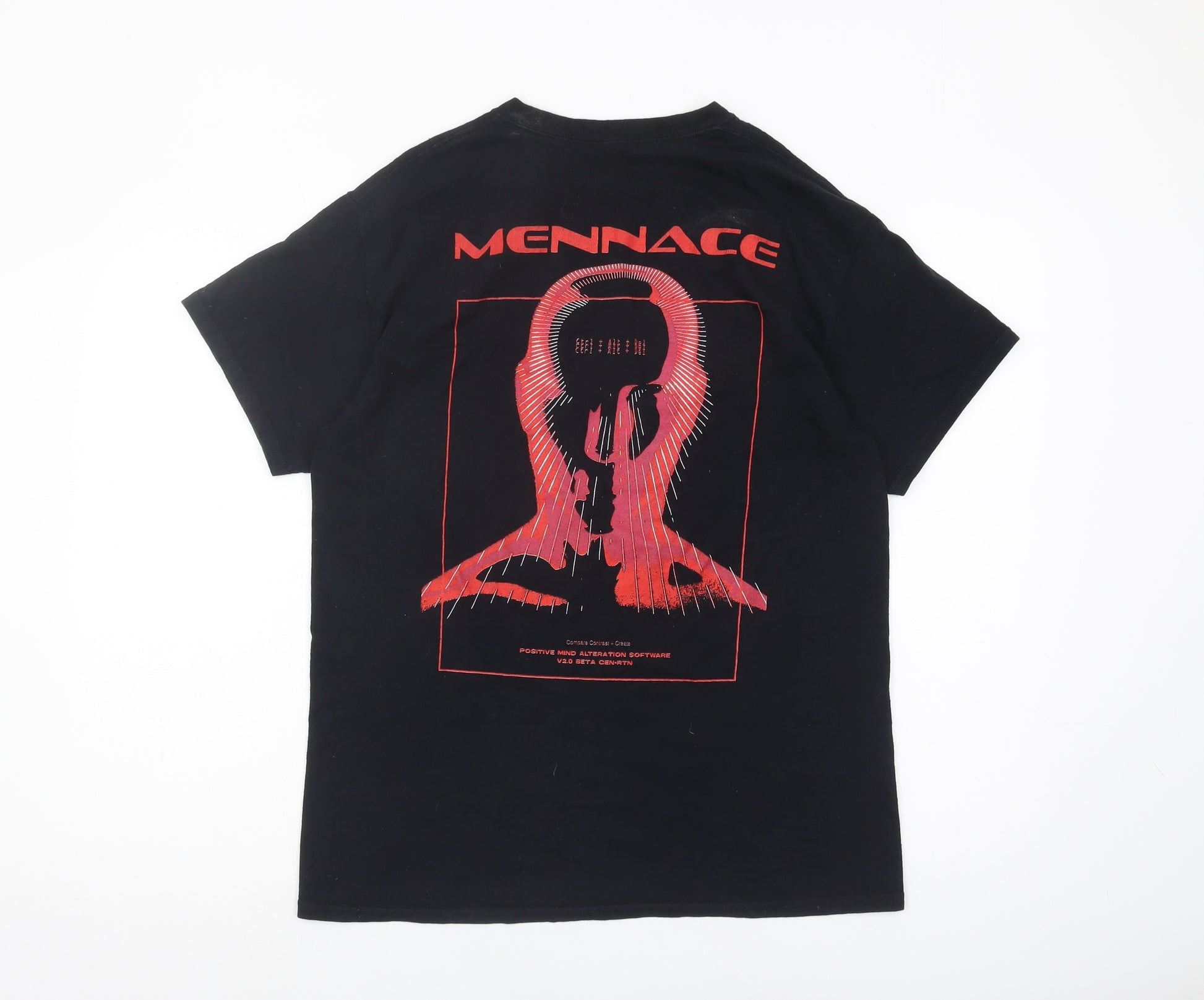 Discover modern style with this Mennace black graphic print T-shirt. Crafted for men and designed with a sleek crew neckline and short sleeves, it offers unmatched comfort and effortless style suitable for every casual outing. Made from high-quality, durable cotton, this T-shirt is both breathable and machine washable, ensuring easy care and long-lasting wear. The standout graphic print adds a unique and trendy touch, making it perfect for everyday style or a night out with friends. Whether you're pairing it with jeans for a relaxed look or layering it under a jacket for added flair, this Mennace T-shirt is a versatile wardrobe staple. Available in a regular fit that complements any body type, this piece effortlessly combines fashion with functionality. Though pre-loved, it remains in excellent condition with no visible wear or damage, promising satisfaction with every wear. Ideal for those who appreciate a touch of graphic art in their attire, this T-shirt invites you to express your individuality. Elevate your casual wardrobe with this distinctive Mennace piece, perfect for those who value both comfort and style.