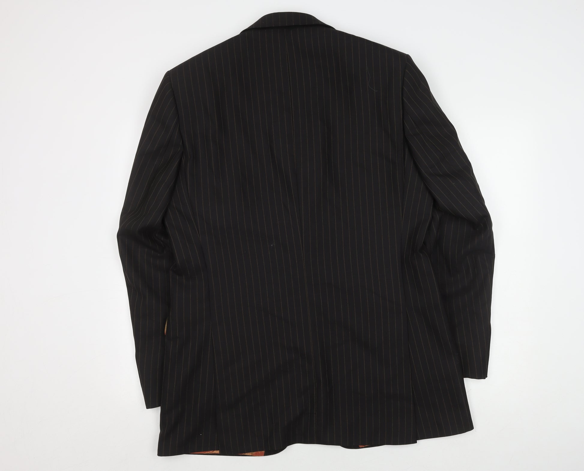 Introducing a classic men's suit jacket, perfect for business and formal occasions. Crafted with precision, this black striped single-breasted jacket features a regular fit. The jacket is made from 100% wool, providing both warmth and elegance. It comes in a long length with a 42-inch chest size, ensuring a comfortable fit for most. The jacket boasts a two-button front, notch lapels, and three-button sleeves, adding a touch of sophistication to any outfit. The lining, made of viscose and acetate, ensures durability and comfort. This stylish piece, ideal for autumn and winter, has a double-vented back for added mobility. Experience the blend of style and function with this dry-clean-only suit jacket.