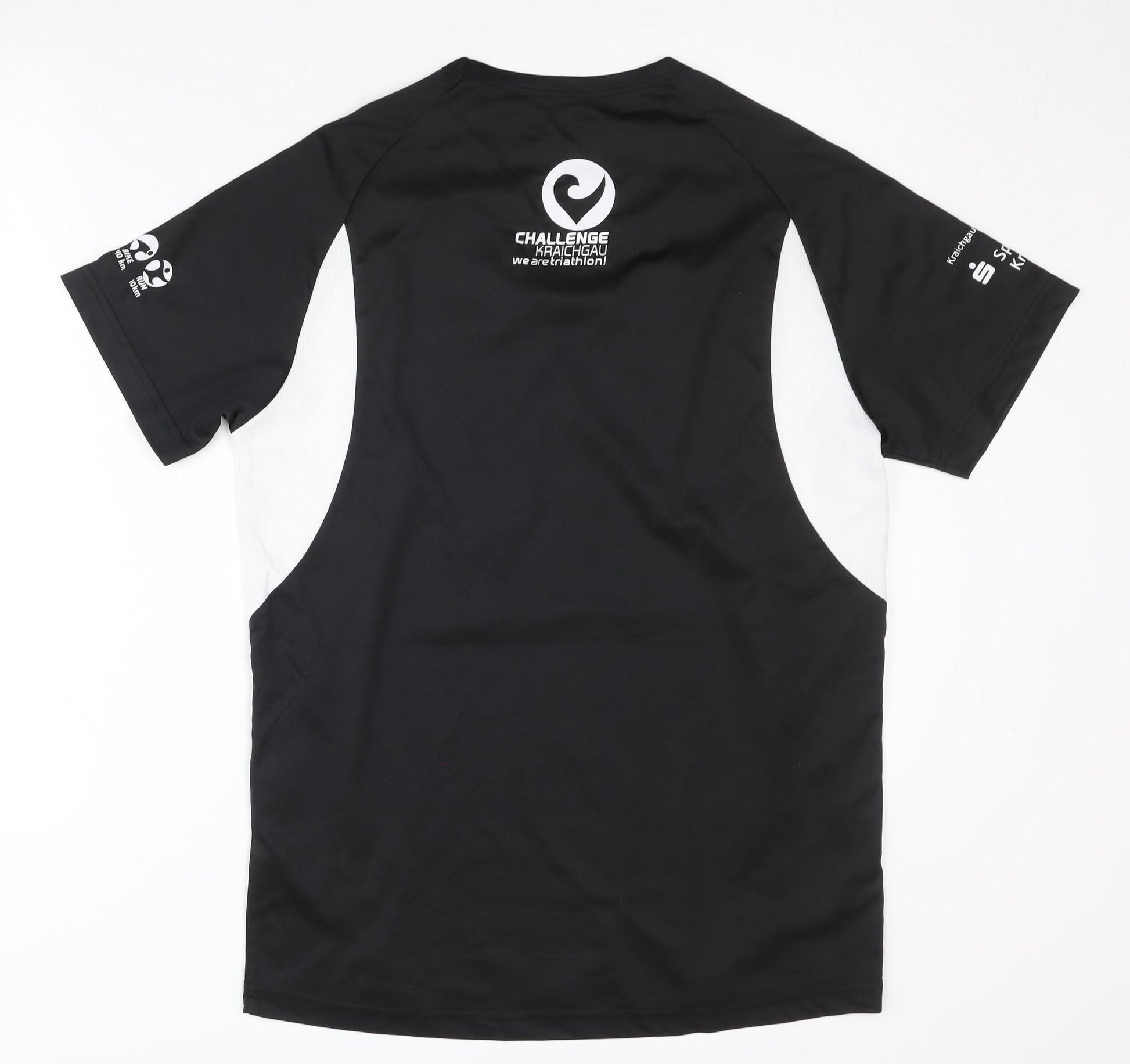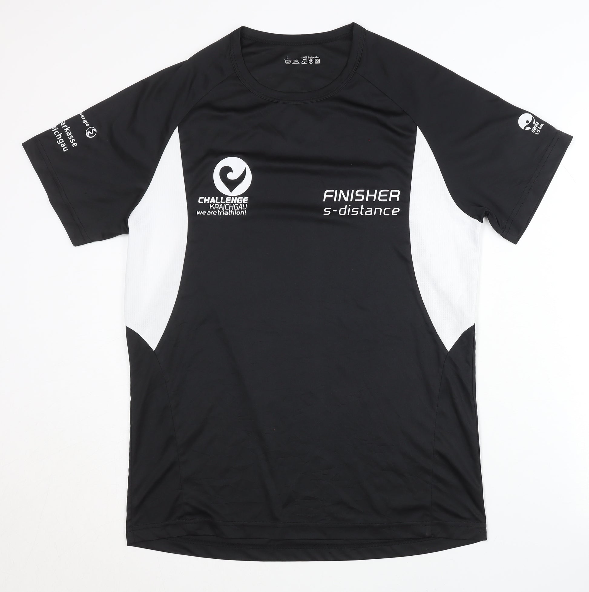 Elevate your athletic wardrobe with this men's black triathlon T-shirt, designed for optimal performance and style. Made from 100% polyester, this breathable and quick-dry shirt ensures comfort during intense activities. The classic crew neck and regular size fit create a timeless silhouette suitable for any active lifestyle. Perfect for triathlons and strenuous workouts, this short sleeve pullover is both functional and stylish. Featuring subtle logo accents, it adds a touch of flair while maintaining a solid, sleek design. Easy care, machine washable make it a practical choice for athletes and fitness enthusiasts. In excellent used condition, this T-shirt shows no visible damage, making it a reliable and affordable addition to your activewear collection. Experience comfort and style with this versatile piece, ideal for all seasons. Secure yours today and enhance your sporting experience.