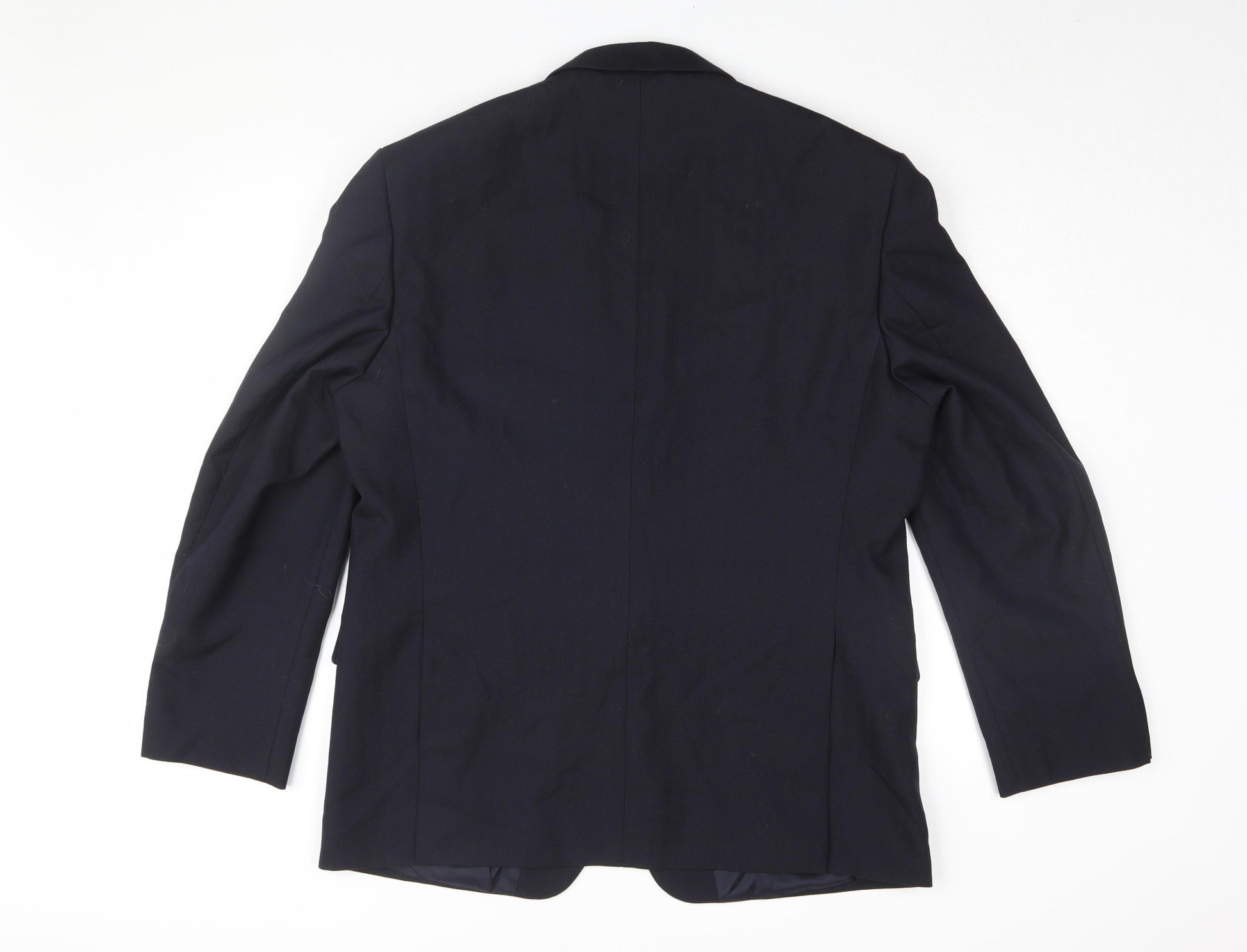 Elevate your formal wardrobe with this classic men's black blazer, perfect for business and formal occasions. Designed for the modern gentleman, it boasts a EUR size 44, equivalent to a UK size 16, offering a sophisticated fit for a range of body types. This single-breasted blazer features a timeless notch lapel with a convenient two-button closure, ideal for layering over tailored shirts or smart knitwear. Made with quality in mind, the blazer combines 55% polyester with 45% wool, providing a durable and comfortable garment suited to year-round wear. The double-vented back ensures added comfort and mobility, while the three-button sleeve and regular length deliver a polished finish. Its acetate lining enhances overall comfort, making it a versatile piece for all-day wear.Stay assured of its excellent condition, with minimal signs of wear and no visible damage, promising a smart appearance every time. Total ease of care with its dry clean only instruction keeps it looking sharp and fresh.Whether you're heading to a business meeting or dressing for an evening event, this classic blazer is an essential addition to any formal ensemble, marrying style with function seamlessly.