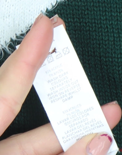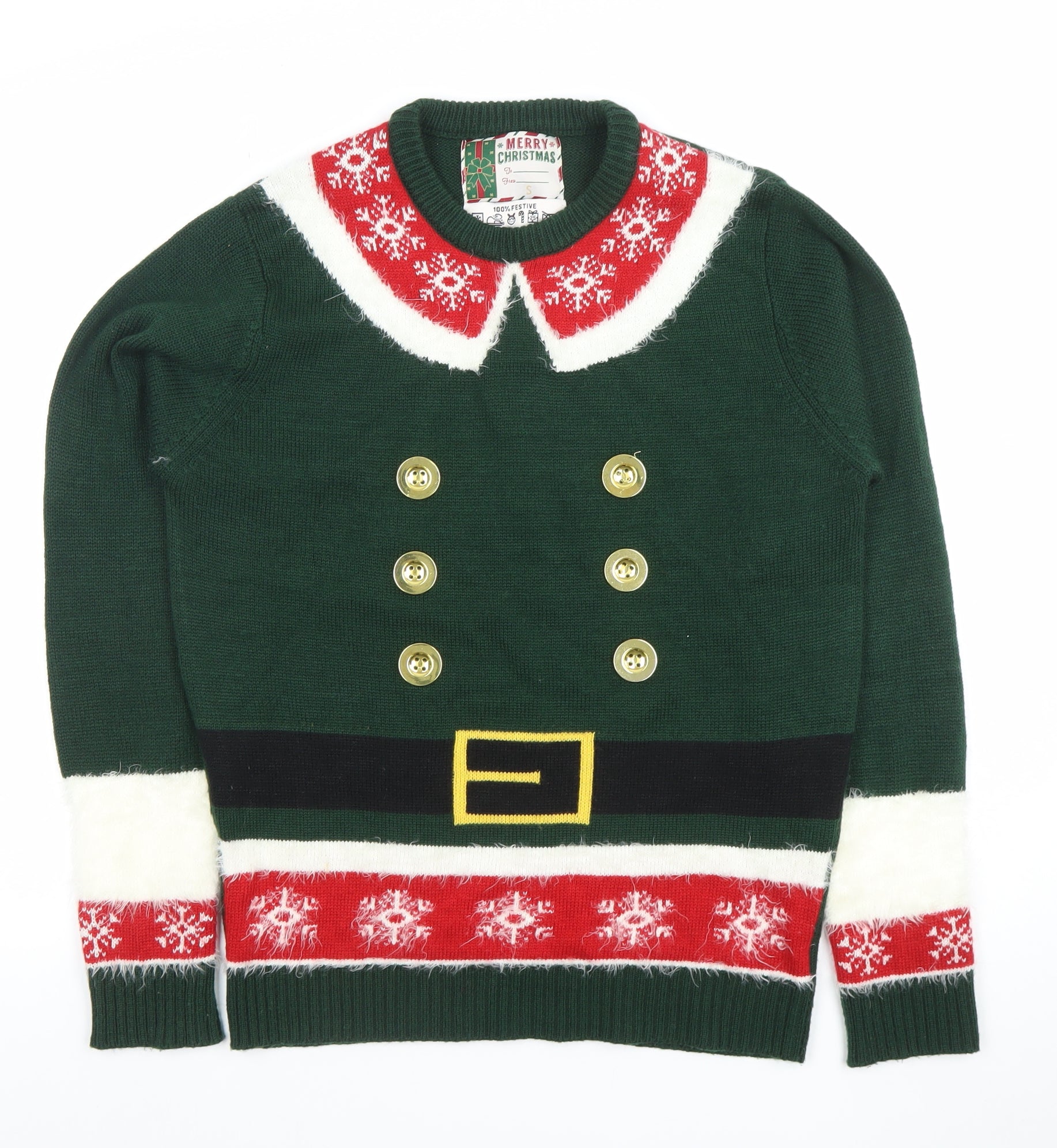 Celebrate the festive season in true holiday spirit with this Merry Christmas men's jumper. Designed in a rich green with a playful elf-inspired motif, it features bold decorative gold-tone buttons and a black belt detail embroidered across the midsection. The contrasting red and white trims with snowflake patterns add a classic Fair Isle touch, giving you that unmistakable Christmas feel. Made from a soft and comfortable 95% acrylic and 5% nylon knit, this pullover provides warmth and durability while remaining lightweight. The tight-knit construction helps maintain its structure, making it ideal for seasonal gatherings, winter parties, or casual holiday wear. The regular fit ensures ease of movement and comfort, while the crew neckline adds a timeless look that layers well over shirts or under jackets. Whether worn at a Christmas jumper day at work or a festive family evening, this jumper captures the fun, cheerful essence of the holidays. Machine washable for easy care, this green elf jumper blends practicality with style. In excellent pre-owned condition with minimal signs of wear, it’s perfect for anyone looking to embrace the Christmas spirit in a cheerful and comfortable way. A standout seasonal piece that combines humour, tradition, and warmth – sure to spread festive joy wherever you go.