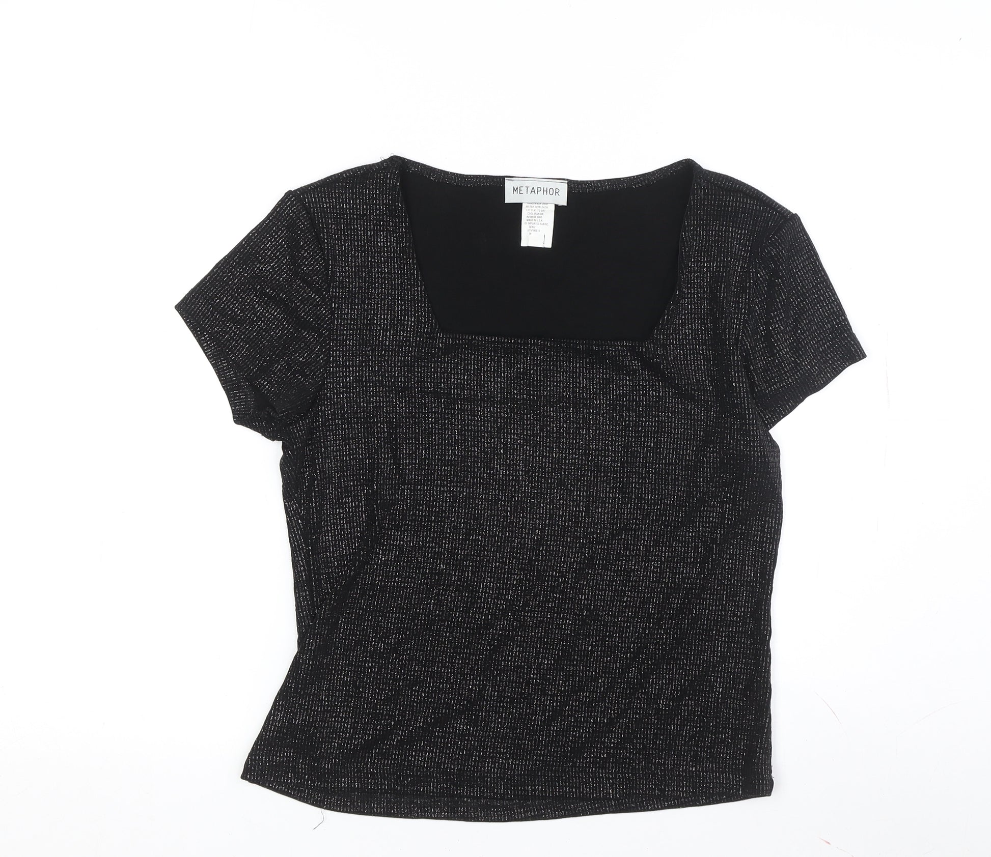 Elevate your casual wardrobe with this versatile Metaphor Women's T-Shirt in classic black. Designed with a chic square neckline, this top offers a modern twist to the basic T-shirt silhouette. Made from a comfortable knit fabric comprising 80% nylon and 20% polyester, it boasts a stretchable and breathable construction perfect for all seasons. This regular fit, short sleeve tee is ideal for casual occasions and can be effortlessly paired with your favorite jeans or skirt for a polished yet relaxed look. Hand wash only for lasting comfort and style. Don't miss the opportunity to add this essential piece to your collection.