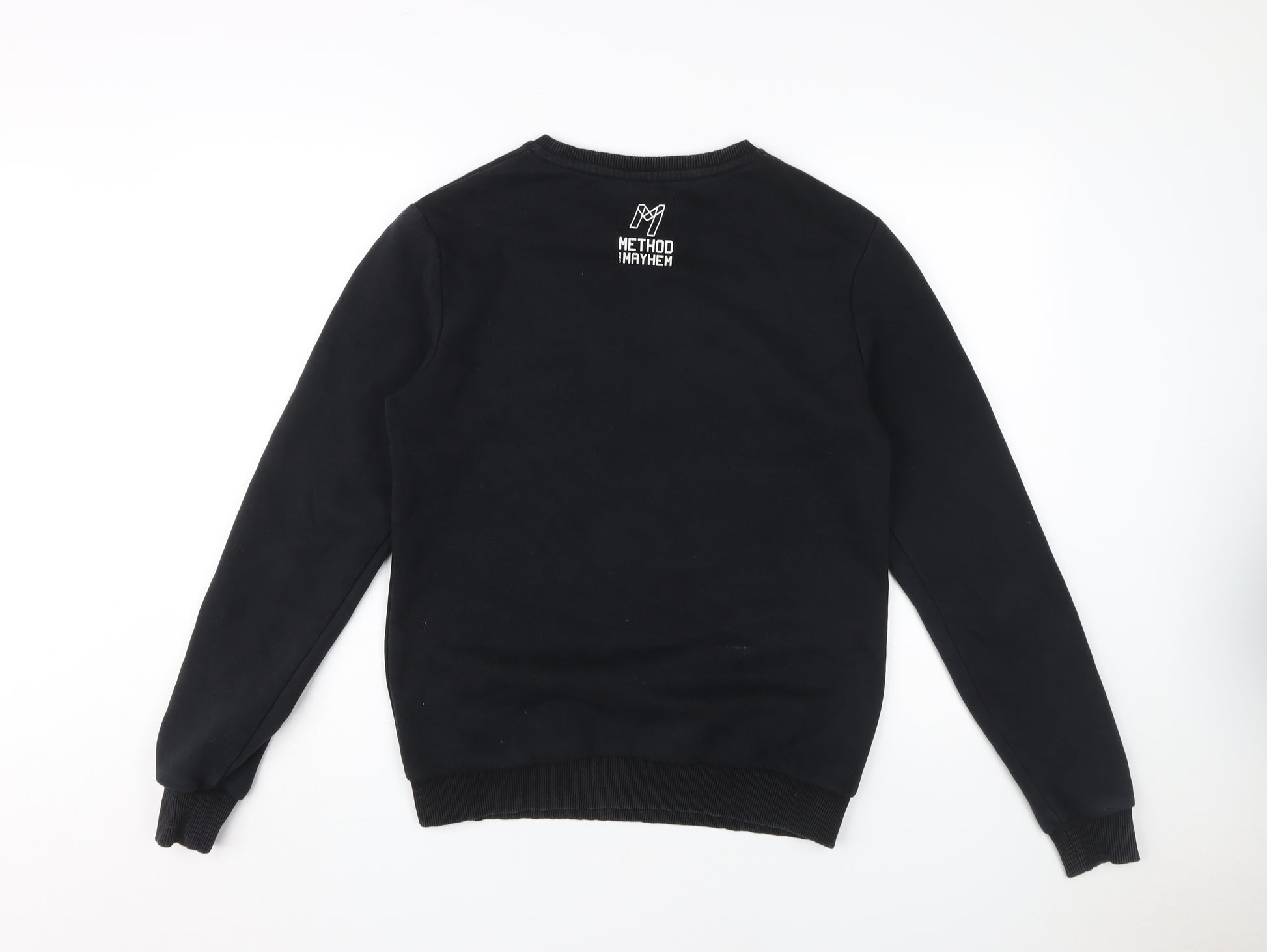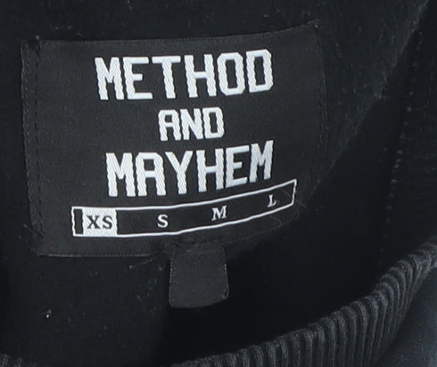 Discover the casual comfort and edgy style of this Method and Mayhem Men's Sweatshirt in a sleek black colour. Perfect for a leisurely day out or relaxing at home, this XS-sized pullover features a bold 'Anti Truth' graphic print that adds a modern twist to any wardrobe. Crafted from 100% cotton jersey, the sweatshirt ensures a lightweight feel while providing cozy warmth during all seasons. Its regular fit and crew neckline offer a relaxed fit, making it ideal for everyday wear. Machine washable for easy care, this versatile piece is designed to last. Though it shows very minor wear, it remains in excellent condition, making it a great addition to any fashion-forward wardrobe. Enhance your casual look with this stylish sweatshirt today.