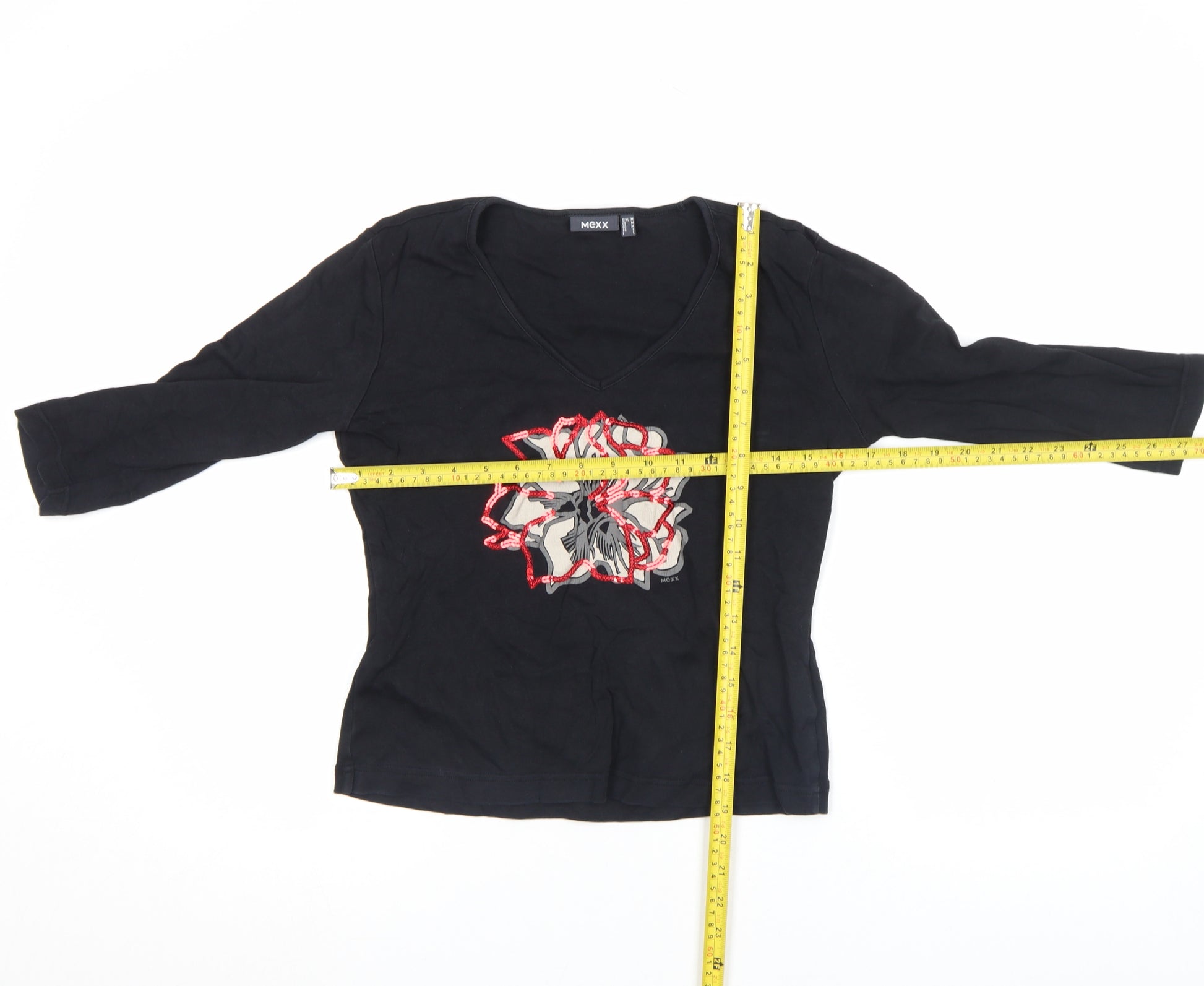 Add a touch of chic casual style to your wardrobe with this stunning Mexx women's black V-neck T-shirt. Crafted from soft 100% cotton, it offers a breathable and comfortable fit that’s perfect for everyday wear. The front boasts a statement floral design in tones of beige, black, and red, beautifully accented with subtle sequins and embroidery for a stylish finish. Its flattering silhouette, classic 3/4-length fitted sleeves, and regular fit make it ideal for layering with jeans, skirts, or trousers throughout the spring, summer, and autumn seasons. This timeless piece easily transitions from daytime wear to evening casual looks, combining versatility with quality cotton jersey comfort. Designed by Mexx, known for their effortless blend of modern elegance and relaxed wearability, this T-shirt ensures you'll always look polished yet laid-back. The pullover style and V-neckline enhance its classic silhouette, while the lightweight jersey cotton fabric makes it easy to care for and a pleasure to wear. Perfect for women seeking both comfort and style, it’s a go-to choice for weekend outings, casual lunches, or lounging at home. The top remains in very good pre-loved condition with only minimal creasing visible, maintaining excellent shape and fabric quality. For effortless everyday fashion with a dash of charm, this Mexx black floral sequin T-shirt is a must-have wardrobe staple that pairs perfectly with denim and accessories for an elevated casual look at an affordable price.