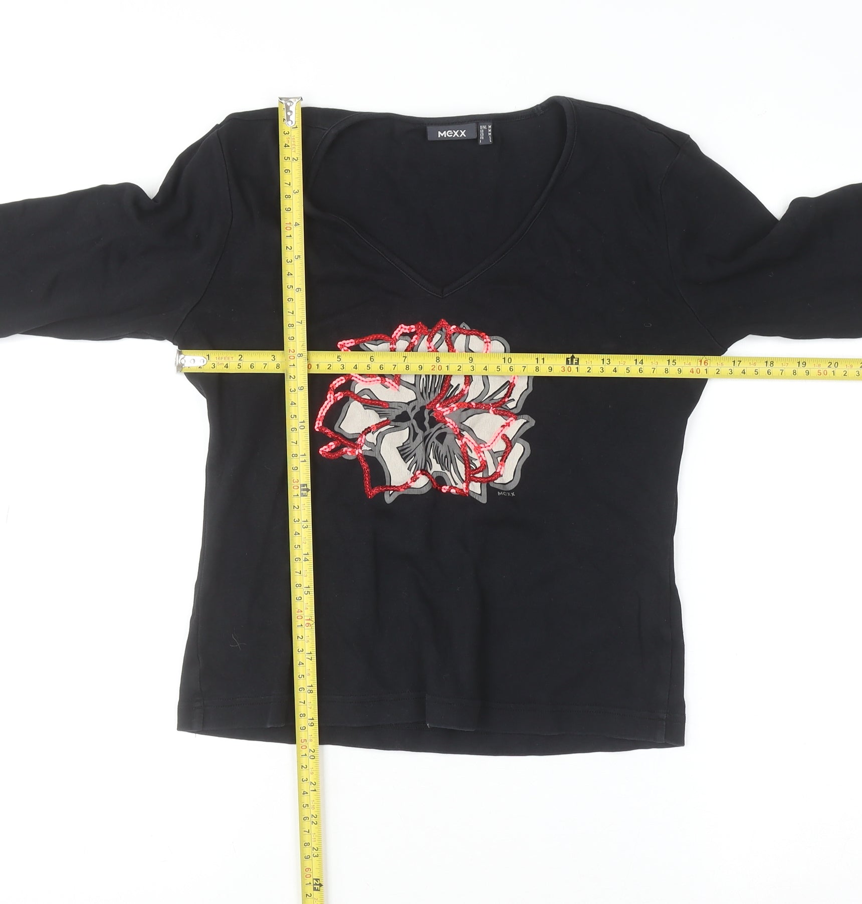 This lovely women’s top by Mexx offers an effortless combination of comfort, quality, and subtle sophistication. Crafted from 100% cotton, the soft, breathable jersey fabric ensures a comfortable fit ideal for everyday wear across seasons. The black base provides a versatile foundation, enhanced by an intricate floral design in the centre. The floral motif features embellished red sequins and embroidery that add a touch of femininity and sparkle, making it easy to transition this piece from day to evening wear.Cut in a flattering V-neckline, the top frames the neckline softly while offering a style that remains casual yet chic. The 3/4 length sleeves make it suitable for year-round layering or standalone styling, striking a perfect balance between coverage and comfort. The regular fit offers ease of movement without sacrificing shape, ensuring a silhouette that suits a variety of body types.Perfect for casual outings, relaxed office days, or pairing with jeans or skirts for smart-casual looks, this Mexx top stands out through its simplicity paired with artistic detailing. Its breathable cotton fabric makes it ideal for spring and autumn, while the easy care, machine washable material ensures convenience for everyday use.The top is in excellent condition, showing minimal previous wear and free of any notable imperfections. It captures a timeless design aesthetic that fits effortlessly into any wardrobe, ideal for women who appreciate understated style with a unique accent.A versatile essential from a trusted brand, this Mexx cotton top represents a great blend of comfort, quality, and casual elegance — a simple piece enhanced by carefully placed sequin embellishment to help you express your personal style with ease.