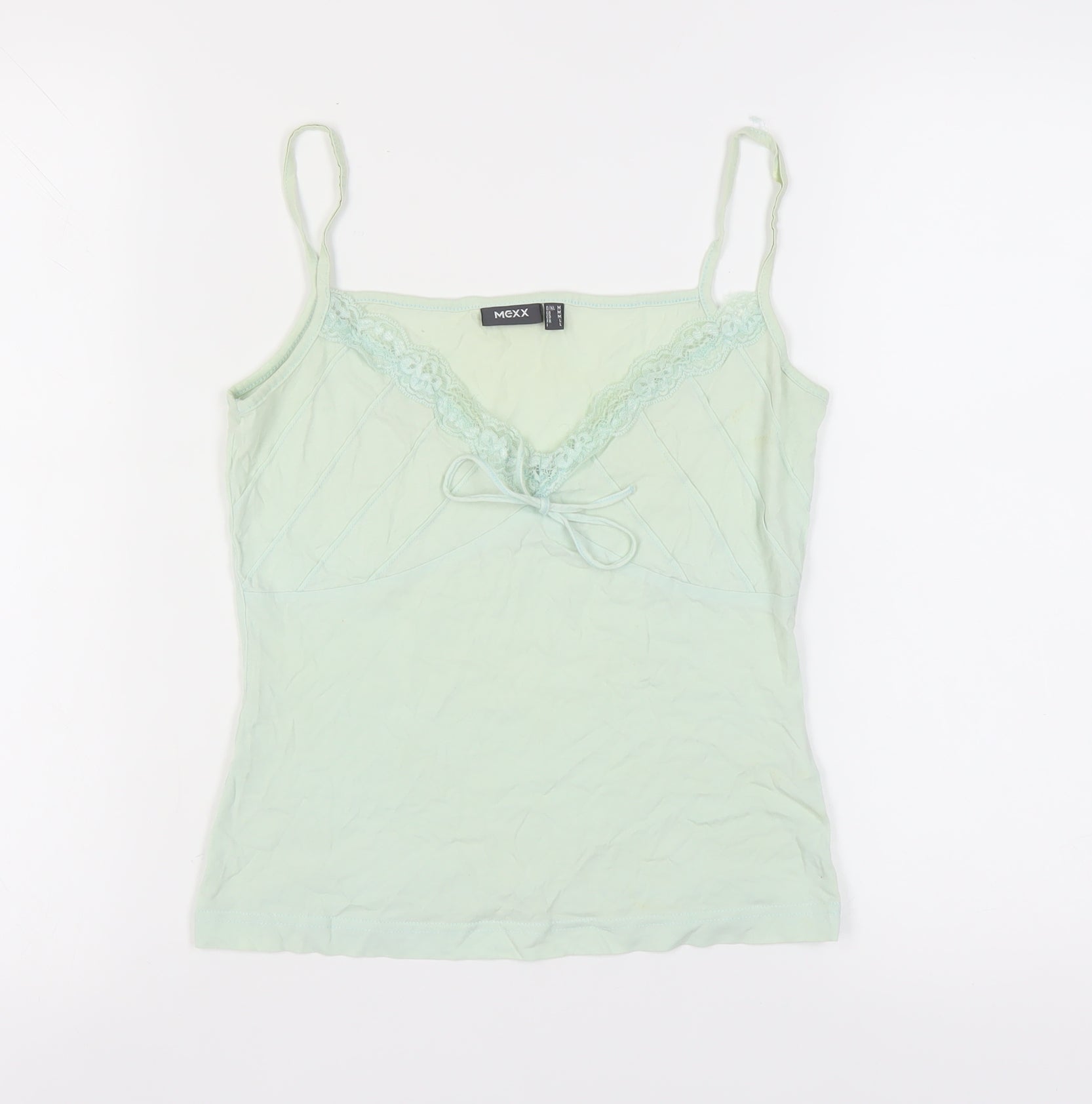 This Mexx camisole tank top is a perfect blend of comfort and style, ideal for the modern woman. Designed in a refreshing green hue, this sleeveless tank features delicate spaghetti straps and a flattering V-neckline accented with a graceful bow and crochet detailing. Crafted from 100% cotton, it promises utmost comfort and breathability, making it an excellent choice for daily wear. The regular fit and solid pattern enhance its versatility, allowing it to be effortlessly paired with any outfit. Although this piece does not come with original sales tags, it is in excellent condition with only slight wrinkles, indicative of gentle pre-wear. Perfect for casual outings or layering under a jacket, this camisole tank top is a wardrobe staple. Machine washable for your convenience, this piece ensures easy maintenance and long-lasting wear, making it an indispensable addition to your collection. Grab this elegant and stylish Mexx tank top today and let it be your go-to for comfort without compromising on style.
