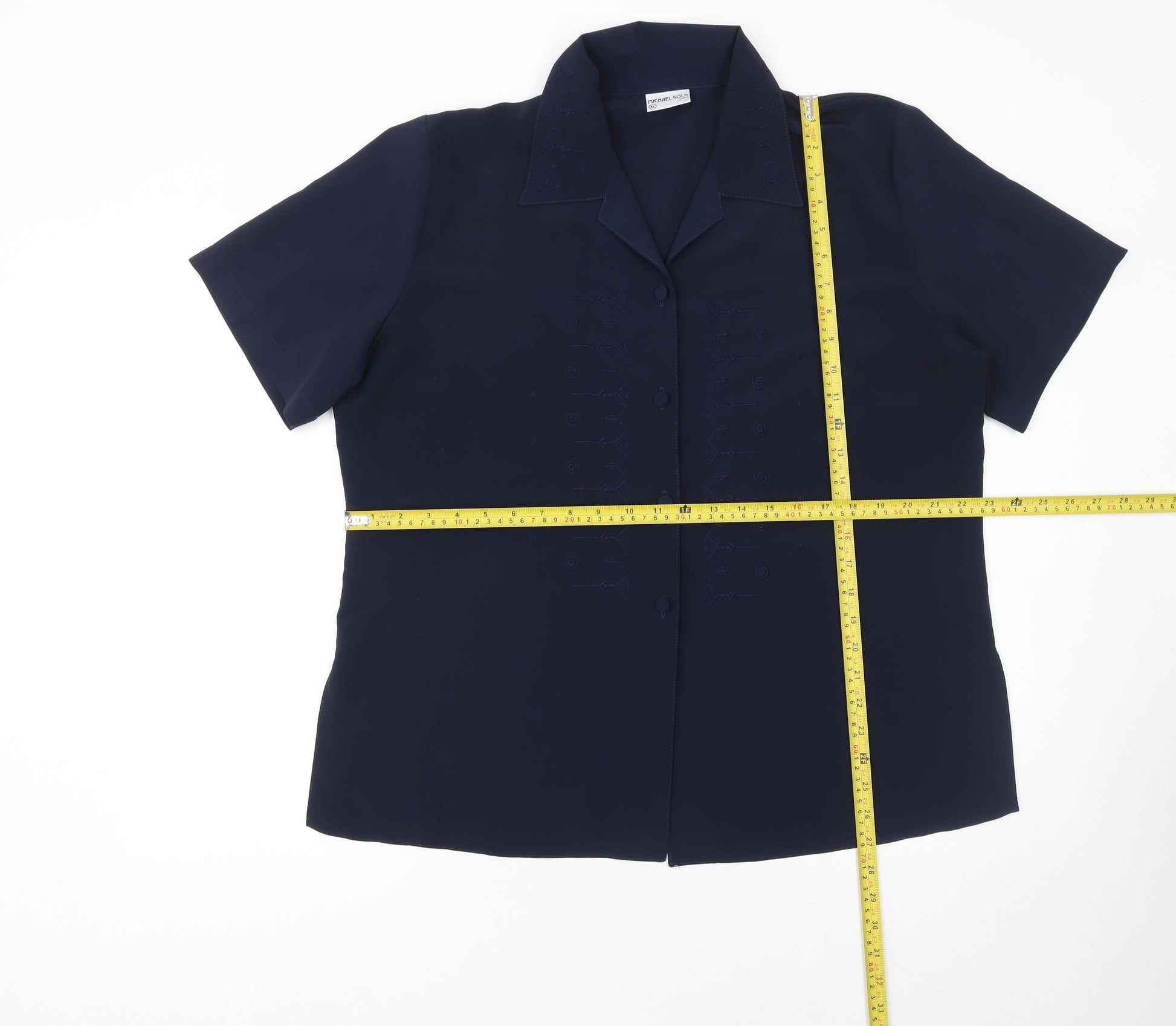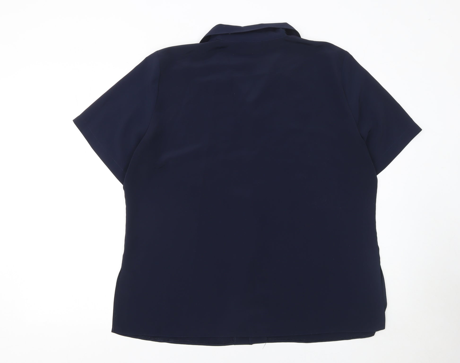 This elegant Michael Gold Women’s Blue Collared Short Sleeve Blouse in size XL beautifully blends timeless style and classic sophistication. Crafted from 100% polyester, this lightweight woven blouse offers a smooth, refined finish ideal for workwear or casual outings. With its rich navy-blue tone and subtle embroidered detailing along the front panel, it exudes understated vintage charm while maintaining a polished silhouette. The short sleeves and collared neckline deliver a traditional yet versatile look that easily transitions across seasons, particularly perfect for spring and summer wear. The button-up front closure adds a neat finish, complemented by durable stitching and a structured cut that ensures comfort and flattering drape. The blouse sits beautifully over trousers, skirts, or jeans, making it a practical and stylish addition to any modern wardrobe. Carefully made in Britain, it reflects thoughtful craftsmanship and quality. Although pre-owned, it remains in excellent condition with no visible flaws or defects, showing minimal signs of wear. Ideal for everyday smart-casual outfits or professional occasions, this blouse brings an effortlessly sophisticated touch to any ensemble. Its easy-care, hand-washable fabric enables convenient maintenance without compromising quality. Whether you are dressing for meetings, brunch outings, or evenings out, this Michael Gold blouse offers enduring appeal and comfort in equal measure. With a flattering regular fit, classic detailing, and refined embroidery, it elevates simple styling while adding a polished vintage flair. A must-have staple that combines classic British tailoring with practicality—complete your look with this timeless Michael Gold piece and enjoy an effortlessly chic aesthetic that never goes out of style.