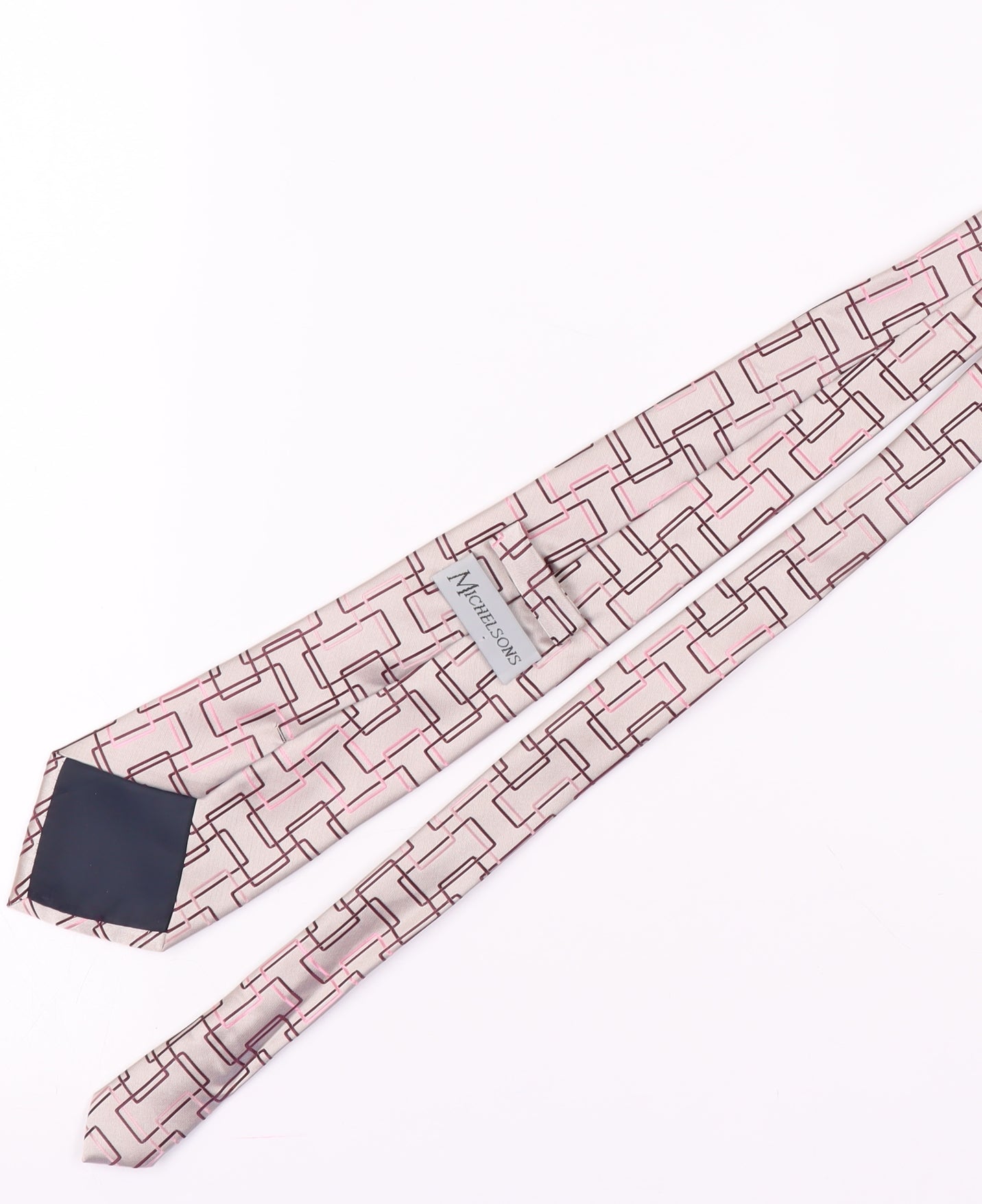 Elevate your formal attire with this sophisticated Michelsons silk tie, featuring a striking multicoloured geometric pattern. Tailored for the distinguished gentleman, this tie serves as the perfect accent to any suit, adding a touch of modern elegance. Made from 100% premium silk, it offers a subtle sheen and fluid drape for an impeccable finish. The intricate geometric design in refined hues captures a timeless appeal, ensuring it remains a versatile accessory for a variety of occasions. Whether for business meetings or formal events, this tie enhances your ensemble with its luxurious texture and stylish pattern. Despite being in excellent condition, it shows minimal wear, highlighting its quality craftsmanship. An ideal gift for him or a suave addition to your collection, Michelsons ties promise enduring style and sophistication.