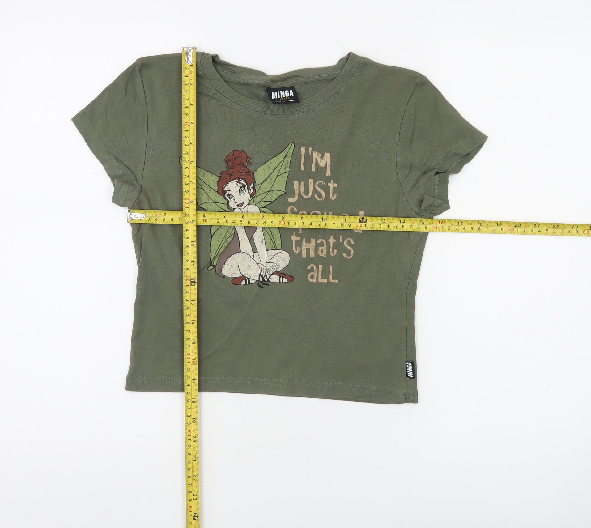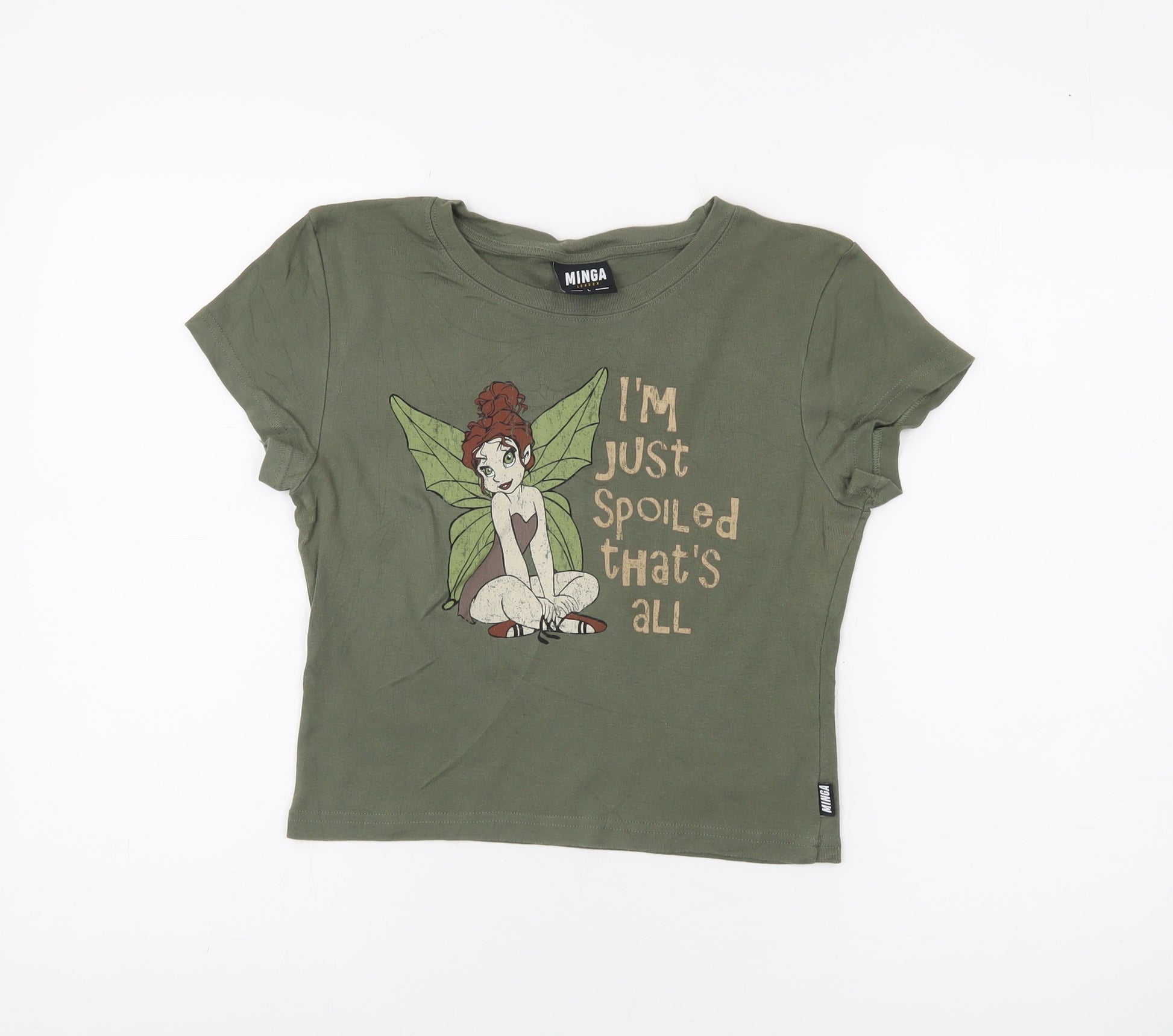 Add some playful charm to your wardrobe with this Minga London Girls Green Cropped Graphic Fairy T-Shirt in size L. Made from 100% cotton, this soft jersey tee is lightweight and breathable, making it ideal for everyday casual wear in the warmer months. The deep olive green hue creates a stylish, earthy vibe, while the front features a whimsical fairy and a cheeky printed slogan that gives off fun, youthful energy. This cropped T-shirt is cut in a regular fit with a crew neckline and short sleeves, providing comfortable and relaxed wear that pairs perfectly with jeans, shorts or skirts.Crafted in Portugal from ethically made materials, this top combines durability with comfort. The premium cotton fabric ensures it feels gentle against the skin, while maintaining structure through repeated washes. Practical, yet full of personality, it captures the contemporary streetwear feel that Minga London is loved for. Ideal for those who like a mix of edgy and cute styling, this piece can easily transition from day to night with a simple switch of accessories. Whether styled for chill weekends, meet-ups with friends or casual school days, this T-shirt brings effortless cool and creativity to any look.Condition is excellent with no visible signs of wear or faults, though it does not have original retail tags attached. Priced affordably and designed to flatter, this Minga London cropped cotton tee is a must-have addition for anyone who enjoys standout fashion with a touch of fun-loving fantasy. Perfect as a gift for a young style enthusiast or a treat for yourself, it’s sure to become a favourite go-to for that laid-back statement outfit.